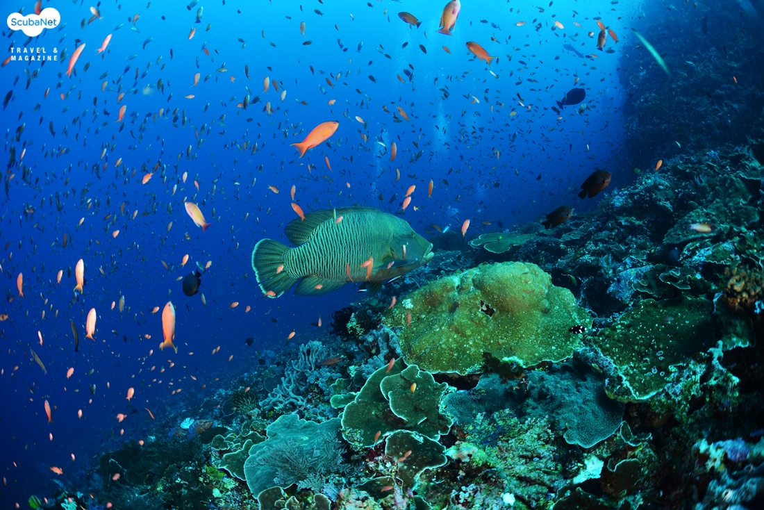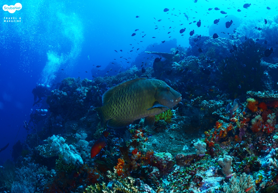수많은 안티아스 무리 속을 유유히 다니는 나폴레옹피쉬
