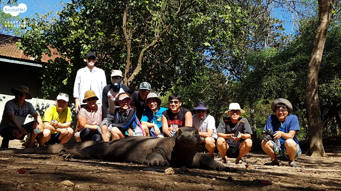 란차섬 트레킹에 나선 다이버들의 단체 사진코모도왕도마뱀의 둥지가 있는 곳을 돌아보는 길이지만 다이버들이 찾을 때는 보통 코모도왕도마뱀들의 짝짓기 시즌이라 도마뱀들은 거의 모두 숲으로 가고 없다. 다만 공원 관리인들의 숙소 아래에서 먹이를 받아먹는 녀석들 몇 마리가 있어서 가이드들이 사진을 촬영해준다. 카메라보다는 휴대폰으로 사진을 찍어주는데 휴대폰을 바닥 가까이 붙여서 도마뱀들이 과장되게 크게 보이게 만들어준다. 다 자라면 3m나 된다고 하지만 그곳에 있는 녀석들은 2m도 되지 않았는데 말 그대로 용처럼 보이게 찍어주는 것이다.