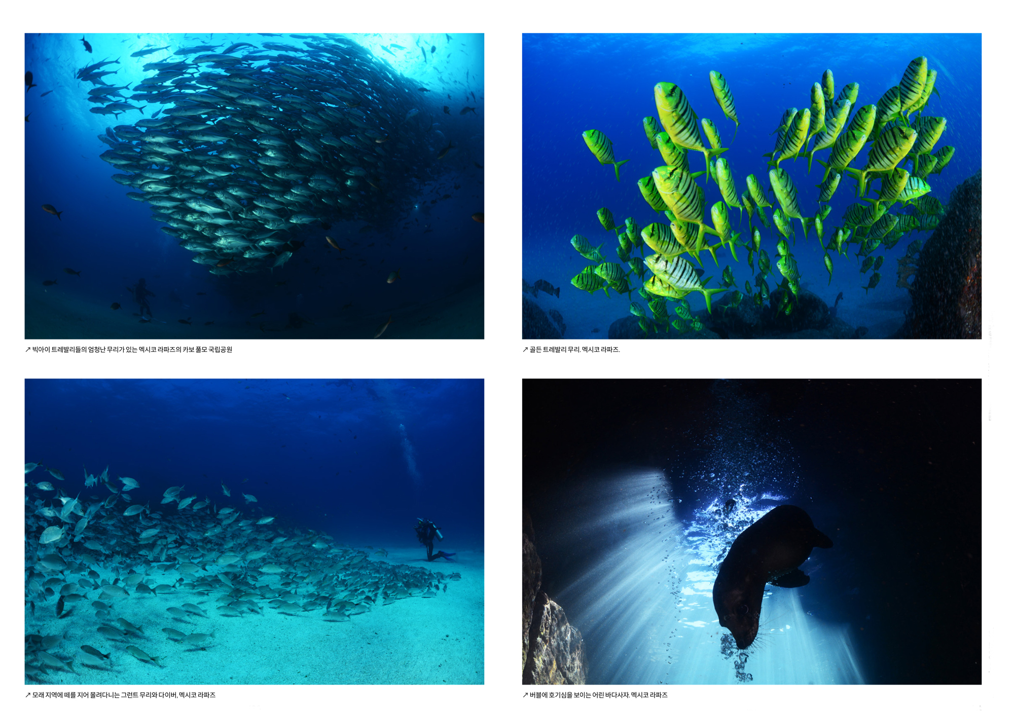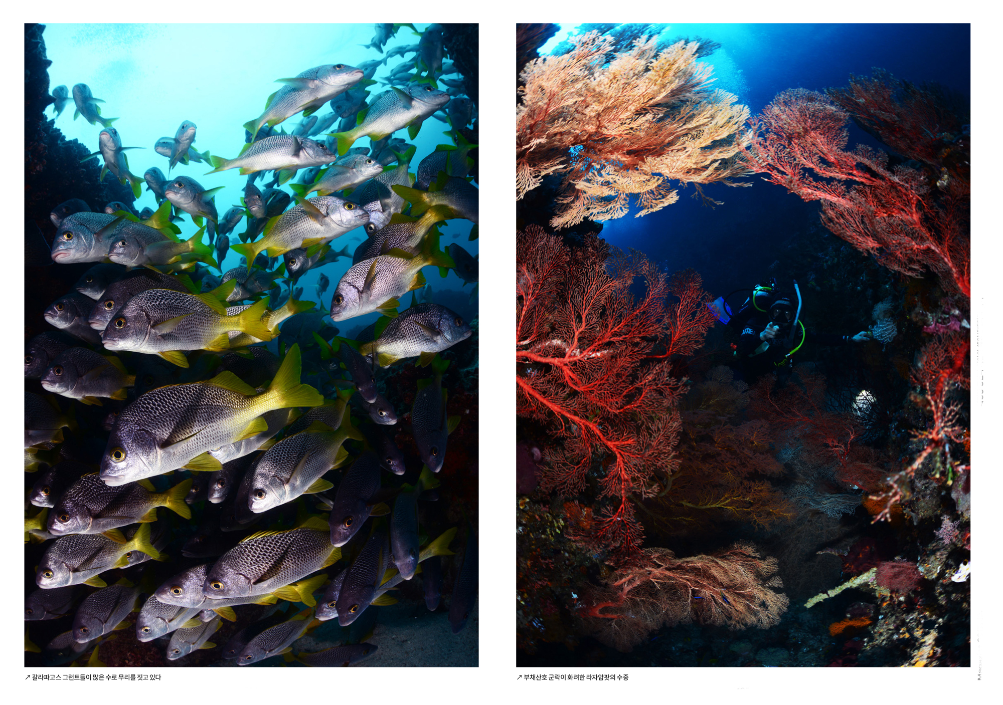 고래상어만 놓고 보면 어디에서 촬영한 사진인지 알기가 어렵다. 고래상어는 전세계 바다를 돌아다니기 때문이다. 사진은 갈라파고스의 고래상어. 엘니뇨와 라니냐다이버들이라면 엘니뇨과 라니냐라는 말을 들어본 적이 있을 것이다. 엘니뇨와 라니냐는 스페인어로 남자아이와 여자아이를 뜻한다. 하지만 이 말이 해양기상학적 용어로 정착되면서 의미하는 바는 좀 달라졌다. 정상적인 해와 달리 태평양 해수면의 평균 수온이 조금(0.5℃~1℃) 정도 올라가는 해가 있는데 이때는 동태평양 지역에 물고기도 많이 잡히지 않고, 홍수가 나며 반대로 서태평양 지역에서는 가뭄이 발생하게 된다. 무역풍이 약해져서 해류의 속도가 평소보다 느려지면서 해수온이 상승하는 것은 물론 비 구름이 이동하지 못하여 태평양 동쪽에 홍수가 나는 것이다. 보통 몇 년에 한번씩 크리스마스 즈음에 일어나기에 이 자연 현상을 아기예수 = 남자아이(엘니뇨)라고 불렀던 남미 사람들의 명칭을 그대로 가져 온 것이다. 엘니뇨가 심해지면 태평양 서쪽에서는 해수온이 과열되면서 산호들이 표백되어 집단적으로 죽게 되는 재앙이 일어나기도 하는데 2016년의 엘니뇨 때에는 호주의 대보초와 몰디브 등에서 그런 일이 발생하였다.