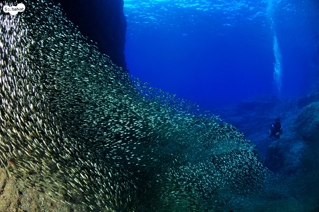 엄청난 무리의 독가시치 유어들. 일본 오키나와