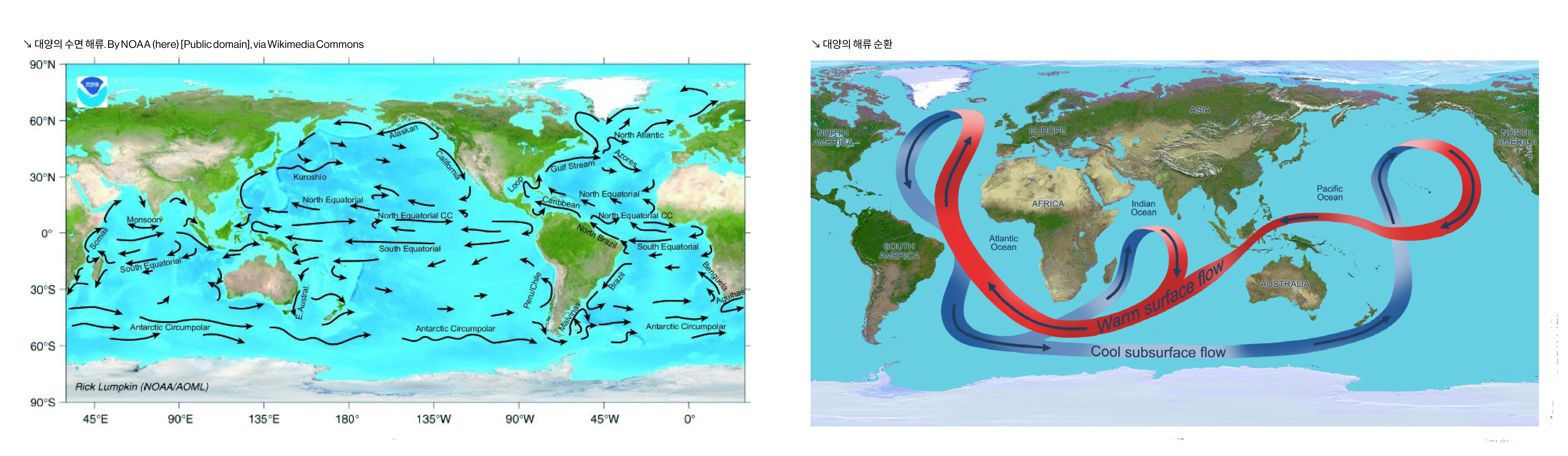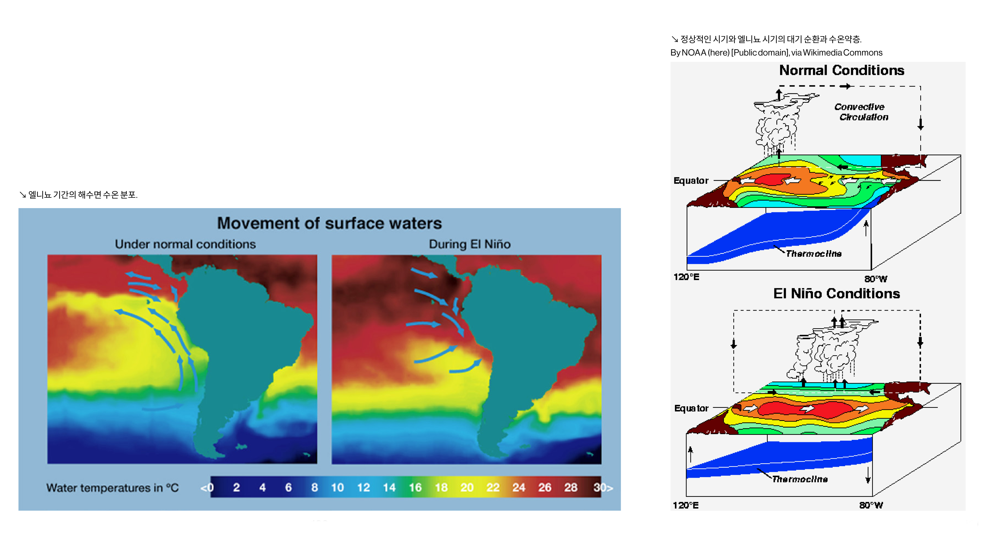 여기까지 살펴본 해류의 영향으로 태평양의 동쪽과 서쪽은 수온에서 큰 차이가 있다. 동쪽은 한류와 잠류 등의 영향으로 적도 근처에서도 수온이 20℃ 내외에 머물고, 서쪽은 적도를 지나오면서 충분히 데워져서 30℃에 가깝게 따뜻해졌다가 적도에서 멀어져 가면서 점차 식게 되는 것이다.