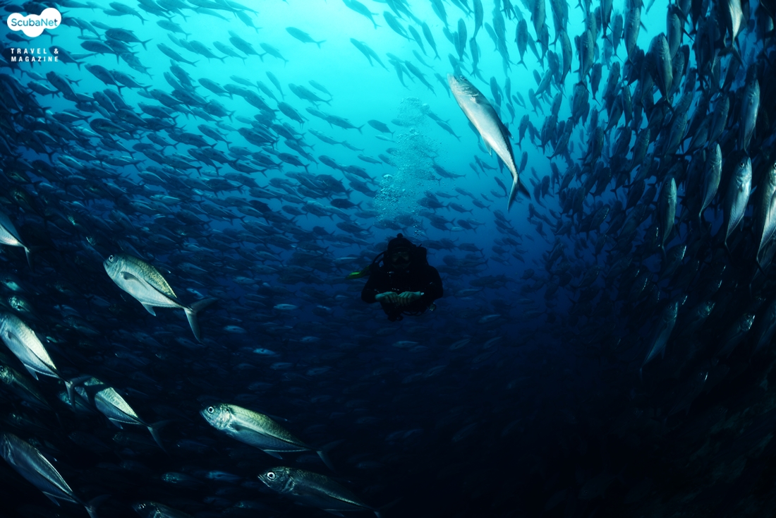 잭피쉬 무리와 다이버. 필리핀 보홀