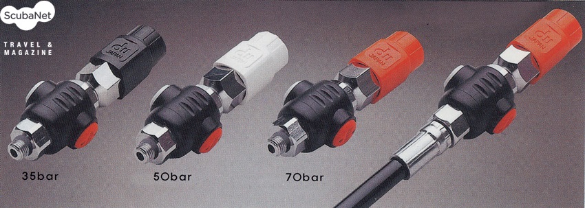 네 번째: 아쿠아 부저라고 불리며, 이는 실린더의 잔압이 설정치보다 낮아지게 되면 소리가 나는 제품이다. 아쿠아 부저는 70, 50, 35 bar로 구분이 되어 있으며, 실린더의 잔압이 정해진 값보다 낮아지면 소리를 울린다. 이것은 잔압 설정치를 변경할 수 없는 제품이므로 자신의 다이빙 취향에 맞게 선택하면 된다(필자의 경우는 70bar를 사용하고 있다).