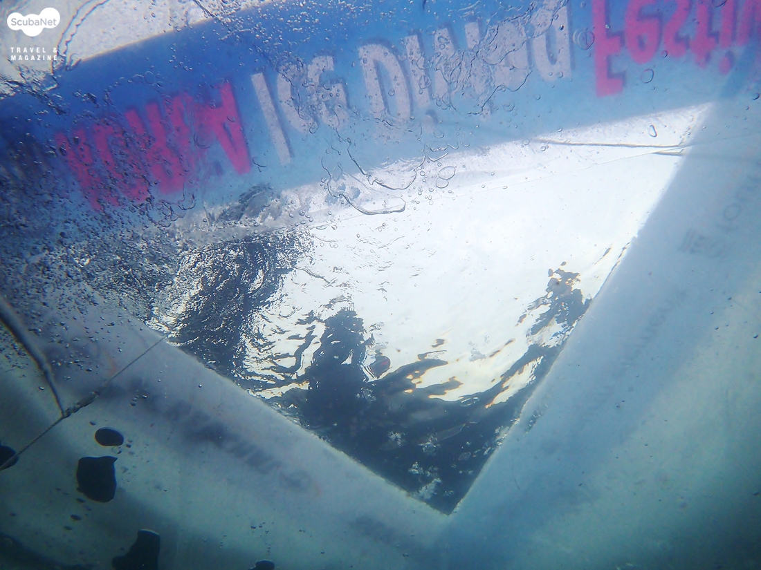 물속에서 얼음 구멍을 본 모습 (맑고 투명해서 얼음위에 글씨가 다 보인다)