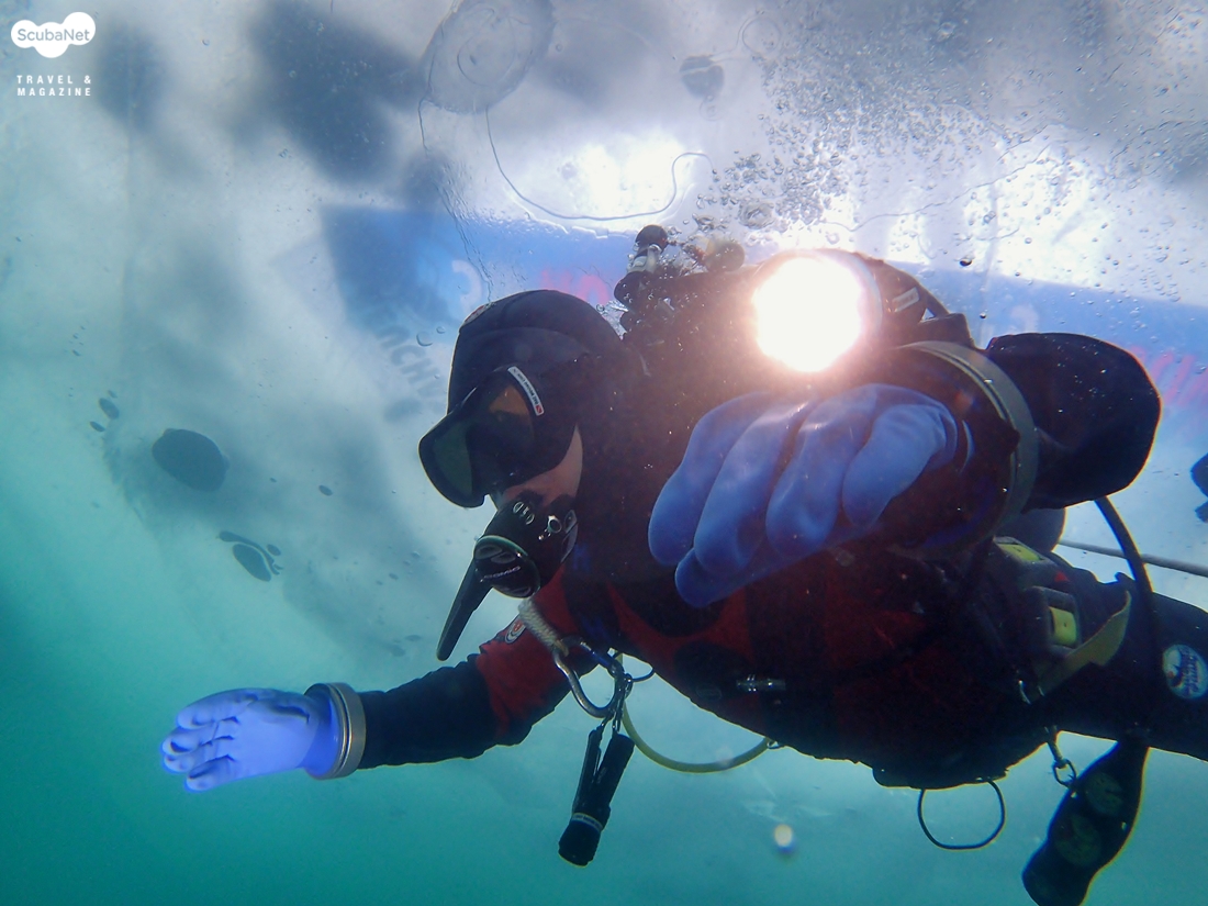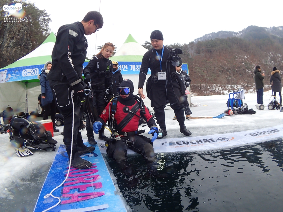 이른 아침 행사장에 도착한 우리 일행은 접수를 했는데 다이빙 순서가 접수 선착순으로 입수가 이루어졌다. 아이스다이빙은 'Over Head 환경' 이라는 특수한 상황에서 진행을 하는 다이빙이니만큼 안전이 최우선이었다. 이날 얼음의 두께는 약 41cm. 그 얼음 밑 속으로 들어 간다는 생각만 해도 머릿속이 하얗게 차가워 지지만, 막상 다이빙을 하면 물 속의 수중 세상이 마치 동화 속의 나라에 있는 듯한 신비한 느낌이다.
