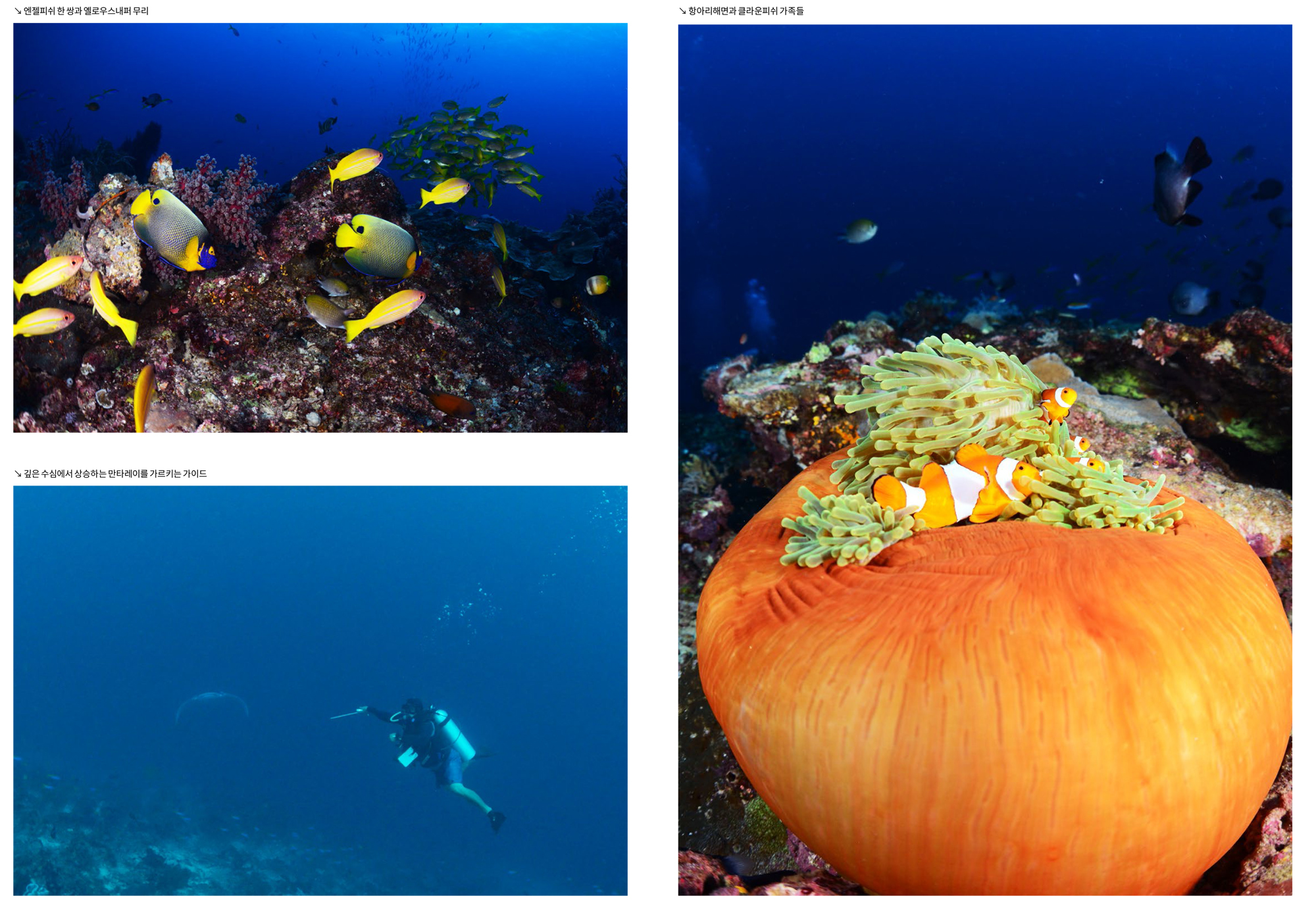 블루스트라이프드 스내퍼 무리, 바라쿠다 무리, 나폴레옹피쉬 등 다이버들이 좋아하는 물고기들과 멋진 산호들이 있었지만 만타는 보이지 않았다. 다시 얕은 수심으로 돌아오는 중에 능선을 따라 깊은 곳에서 만타가 올라오고 있었다. 그러다 다이버들을 보고는 얕은 봉우리 쪽으로 선회하여 사라졌다. 봉우리의 경사를 따라 천천히 상승하면서 클리닝 스테이션으로 다가가니 만타가 클리닝을 받고 있었다. 하지만 가까이 나가가지도 않았는데 만타는 한바퀴를 선회하더니 그냥 사라져 버렸다. 좀 아쉬운 순간이었다.
