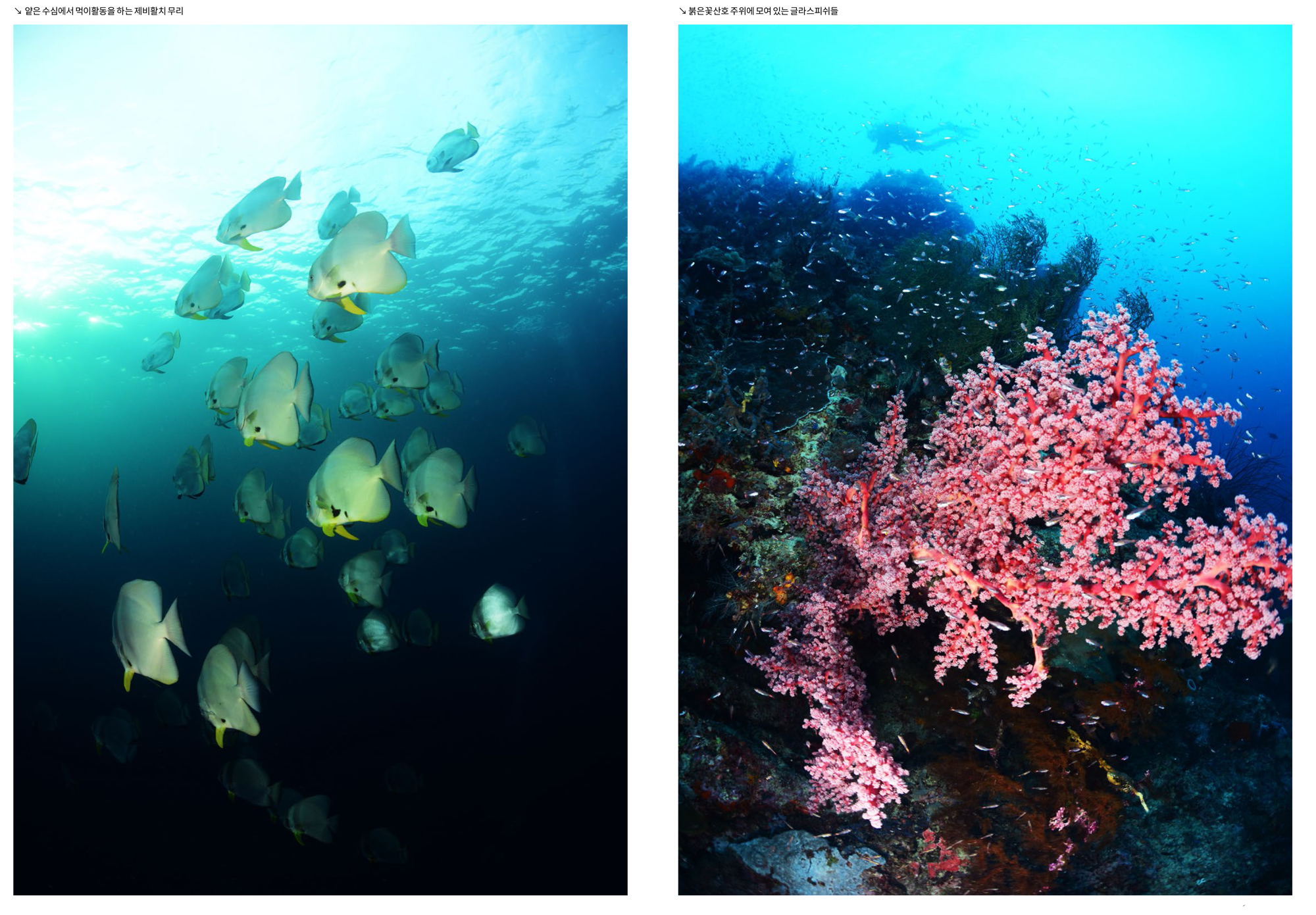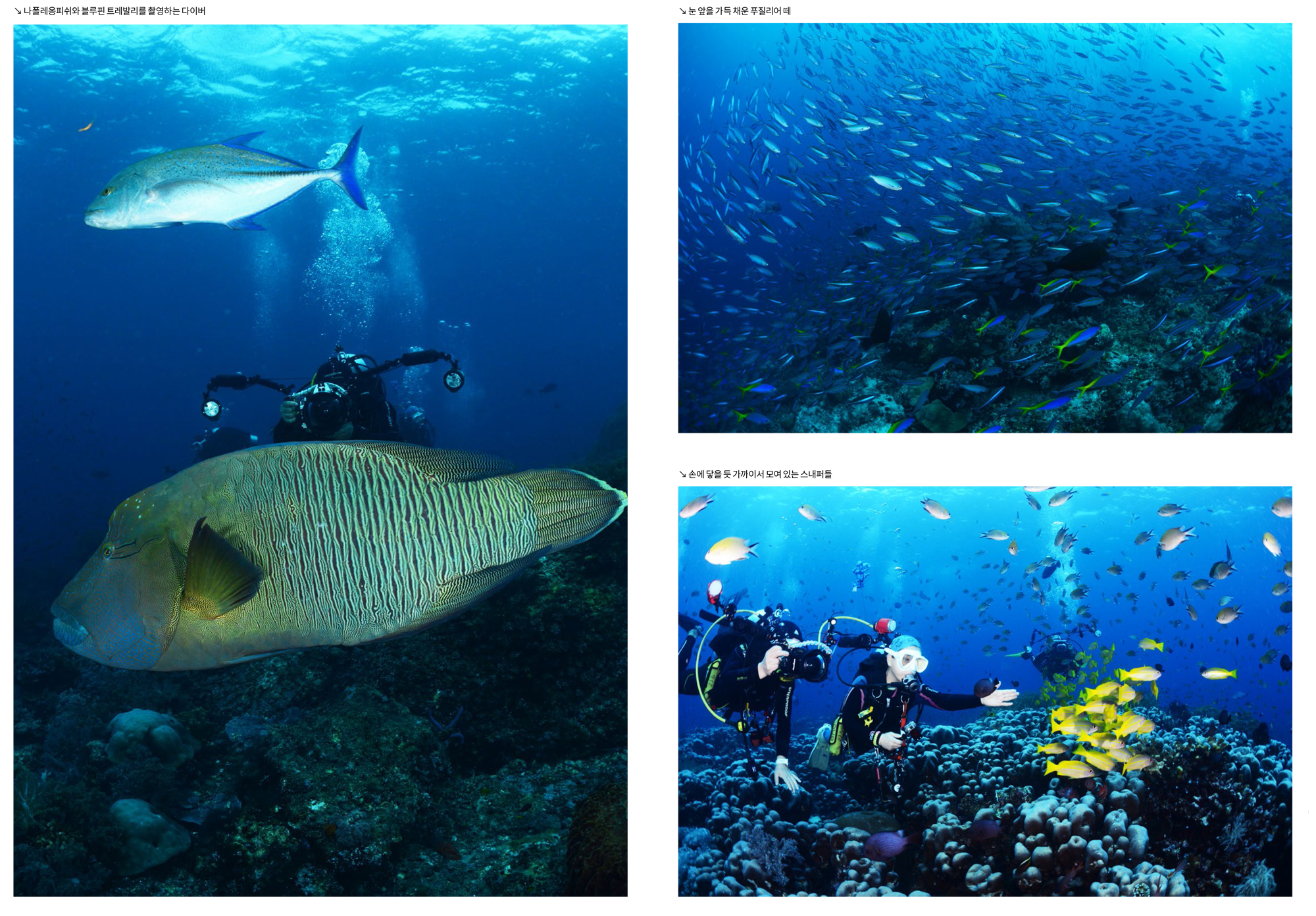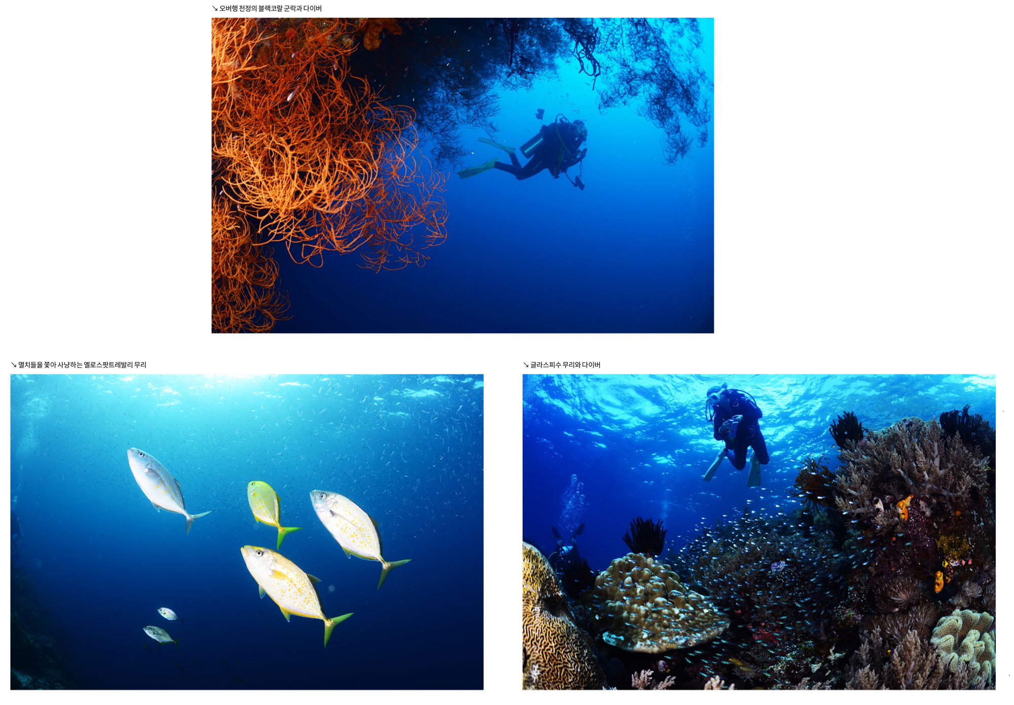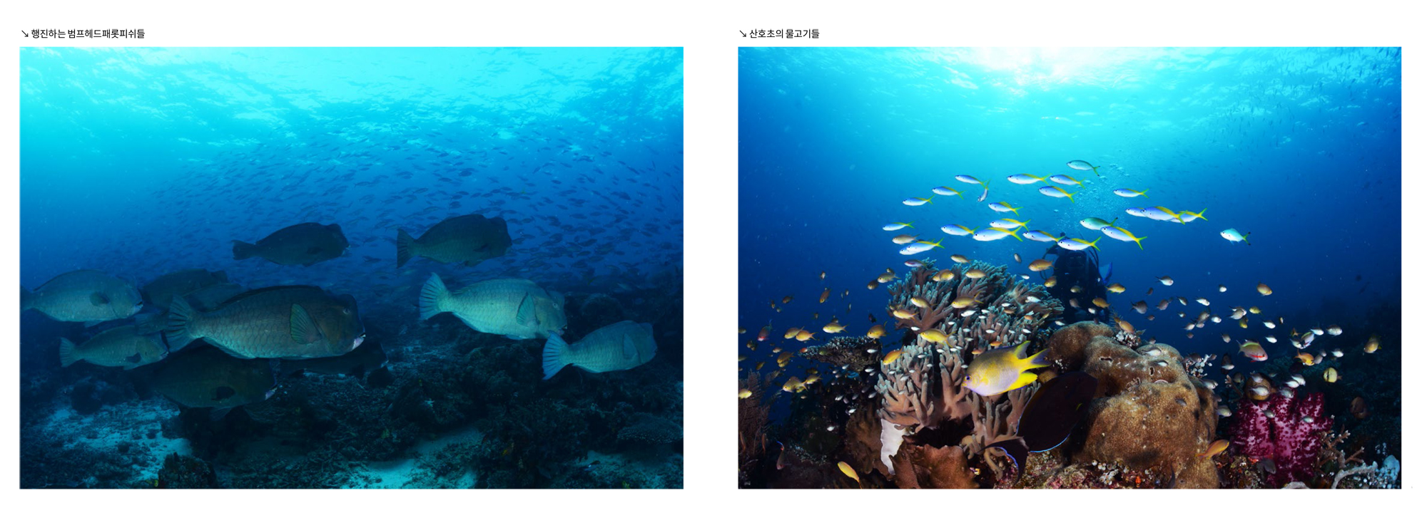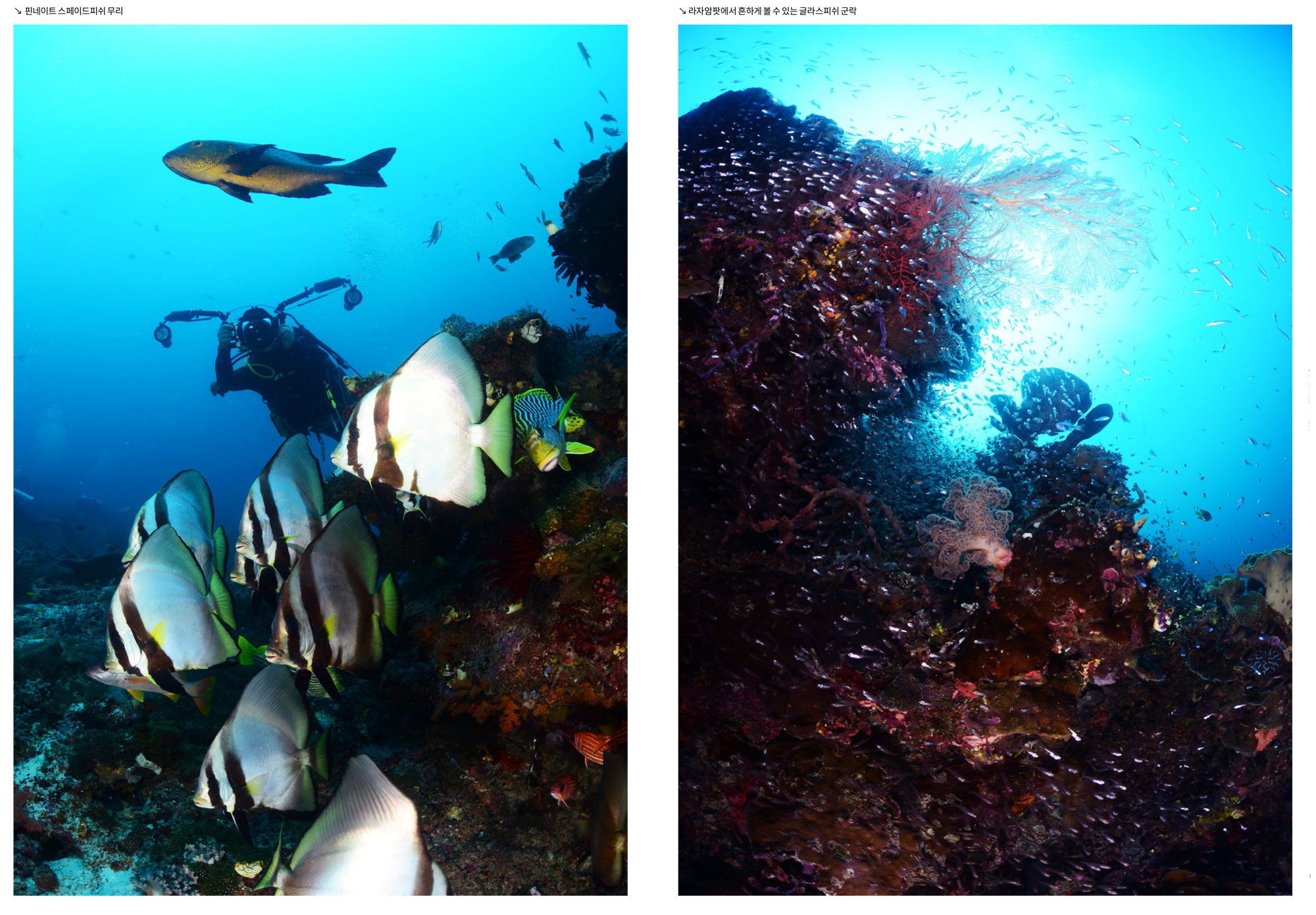 얕은 수심에서는 버섯모양의 바위가 만들어내는 독특한 프레임의 사진들도 촬영할 수 있었으며, 무리지어 다니는 빅아이트레발리들도 만났다. 이 곳에서는 야간 다이빙도 진행되었는데 다이버들은 피그미해마들을 찾아서 촬영하였다.