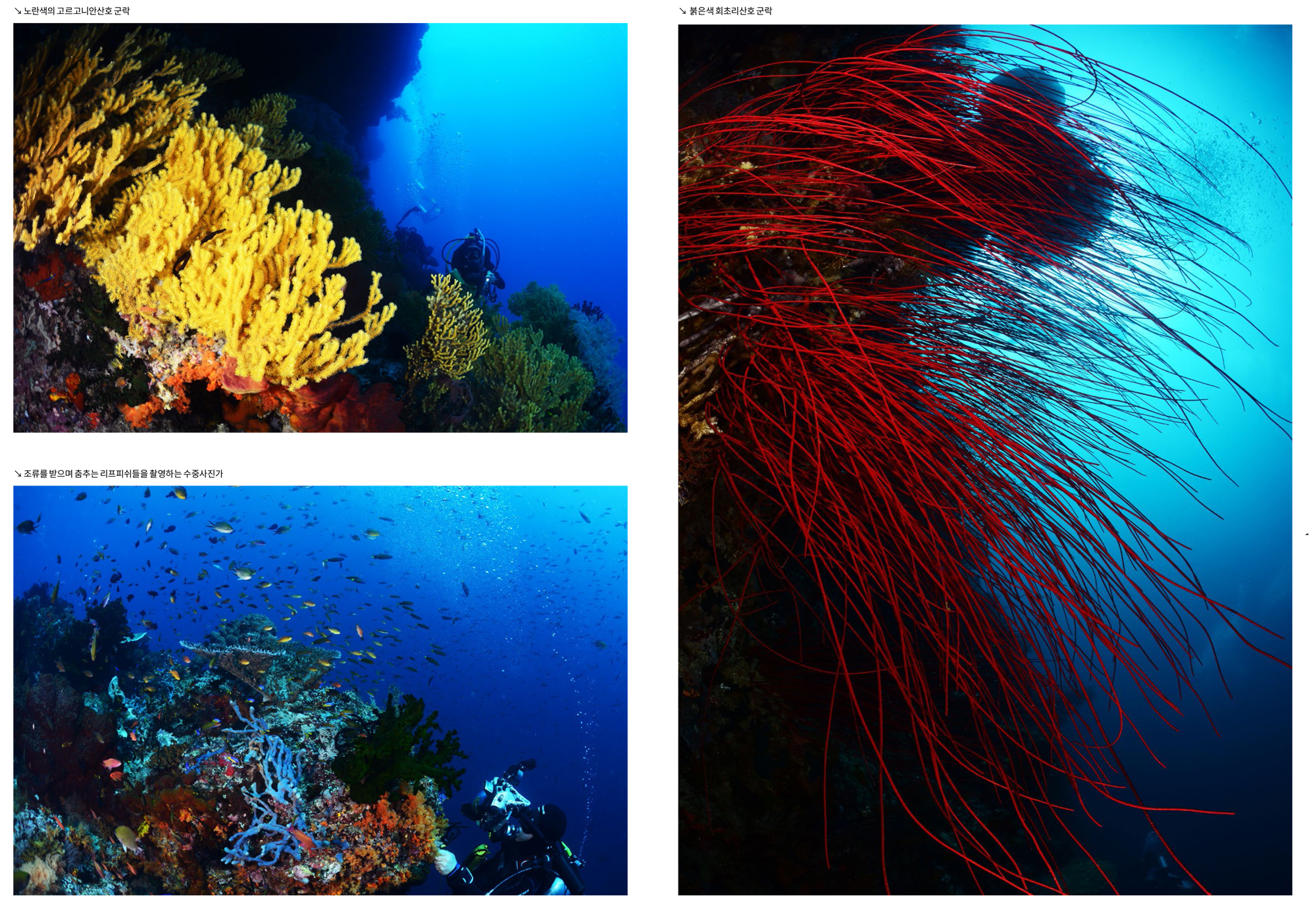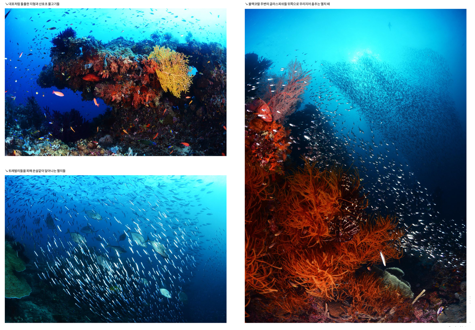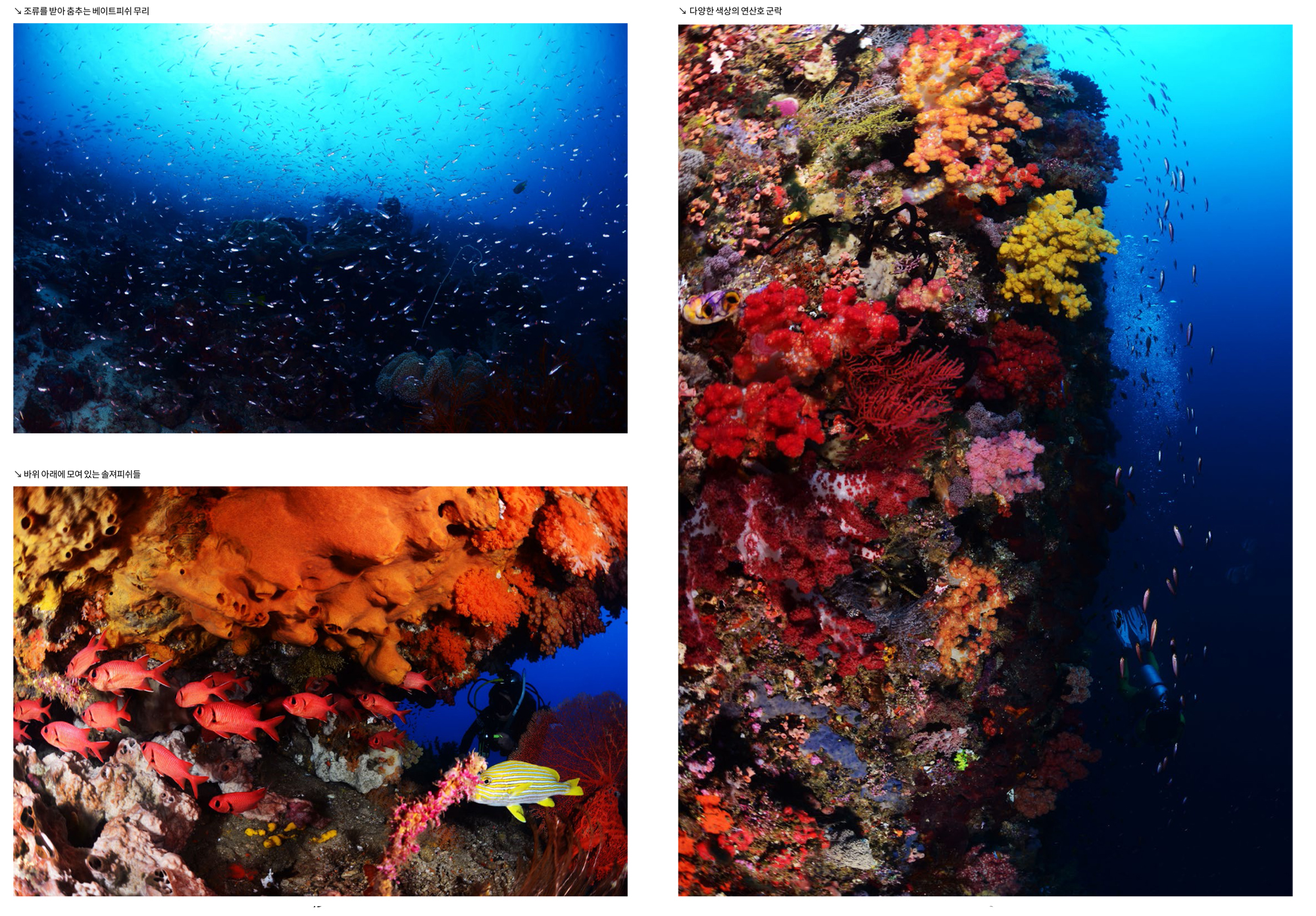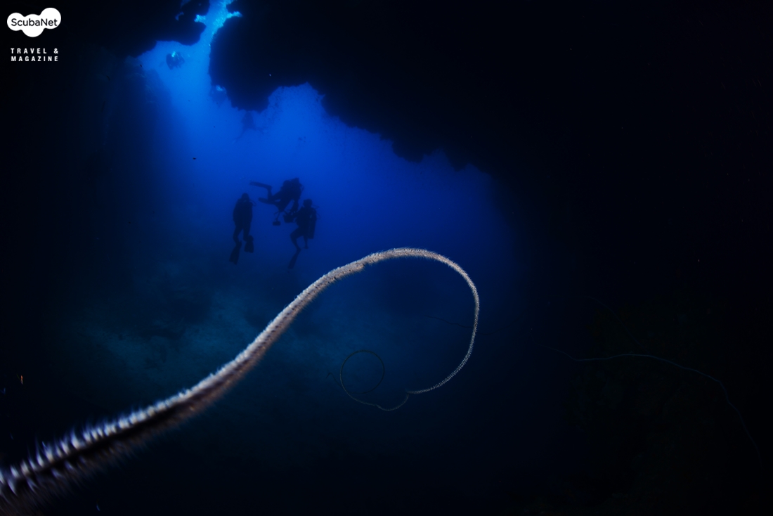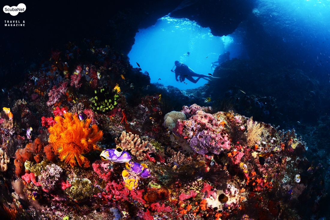 오버행의 천정에서 자라는 블랙코랄과 부채산호를 앞에 두고, 바깥 쪽으로 보이는 푸른 물을 배경으로 다이버들이 지나가는 모습을 촬영하는 것으로 포인트의 분위기를 살려보았다.