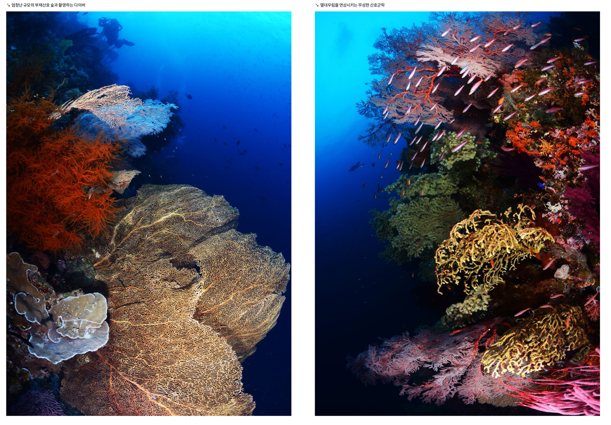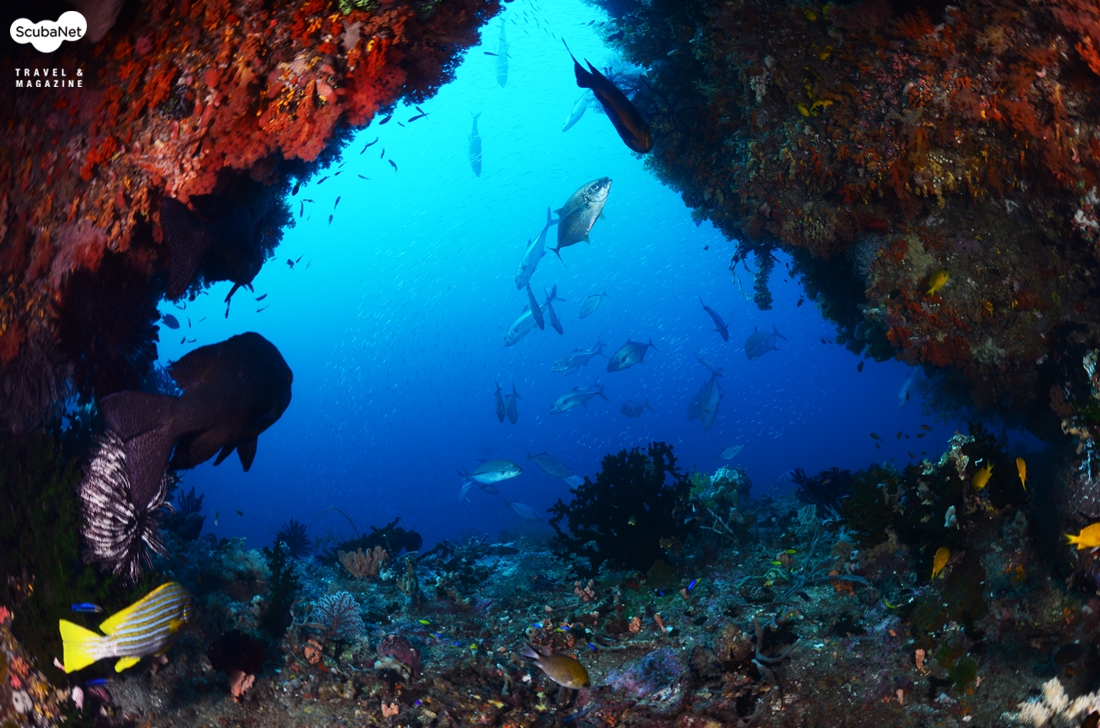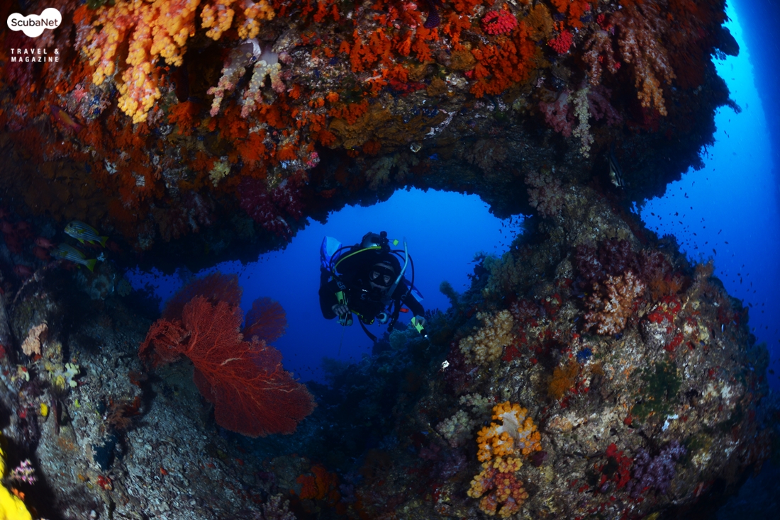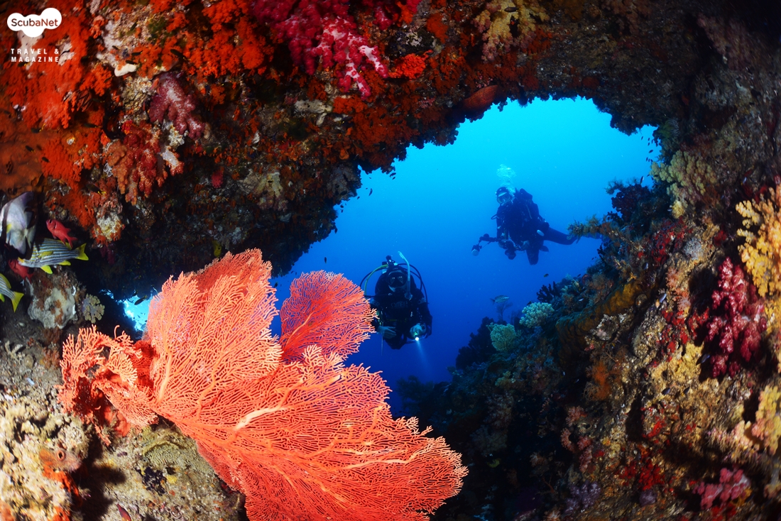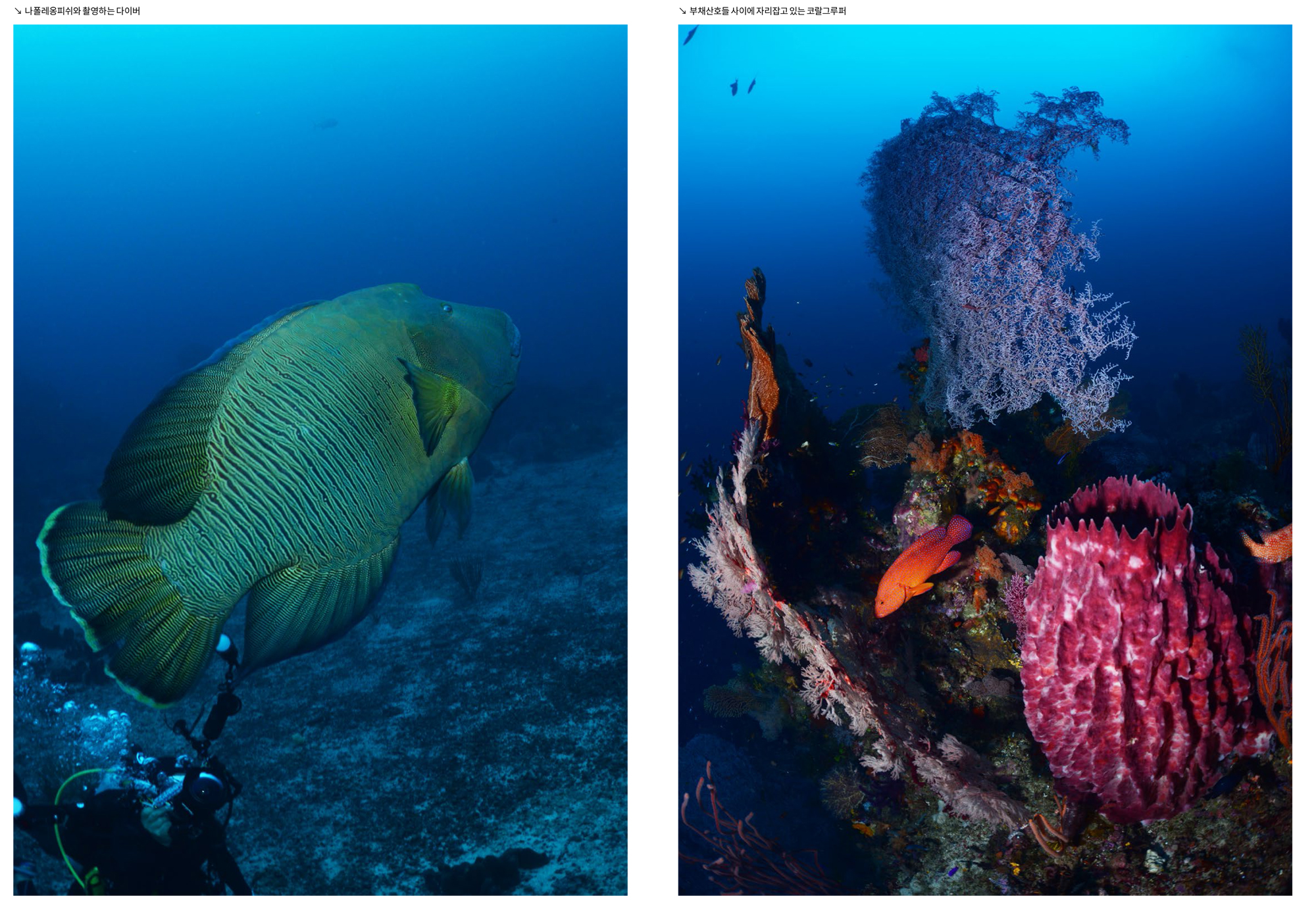 오버행의 천정에서 자라는 블랙코랄과 부채산호를 앞에 두고, 바깥 쪽으로 보이는 푸른 물을 배경으로 다이버들이 지나가는 모습을 촬영하는 것으로 포인트의 분위기를 살려보았다.