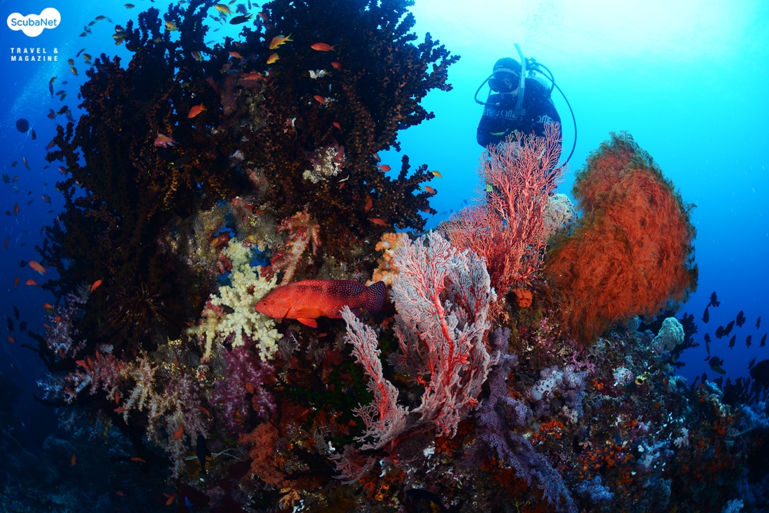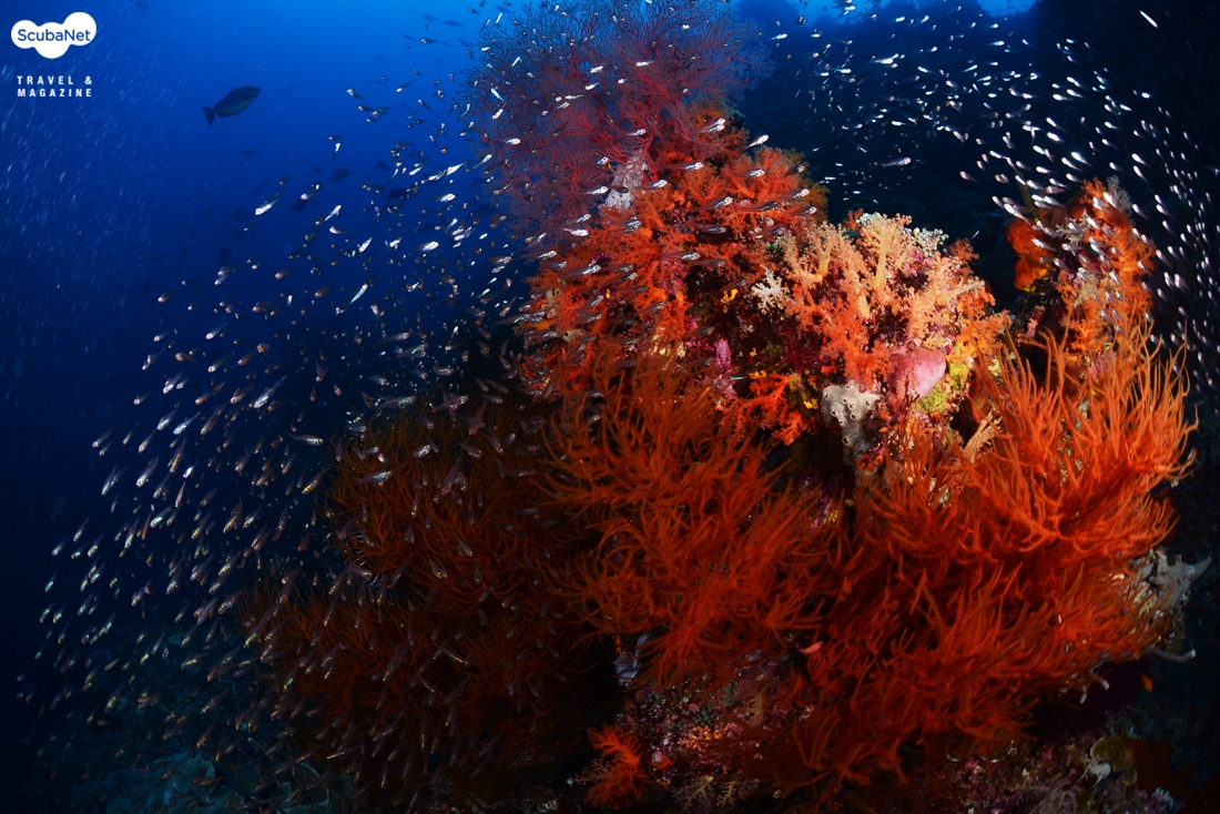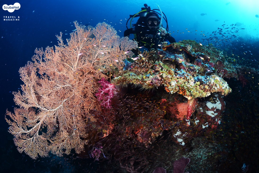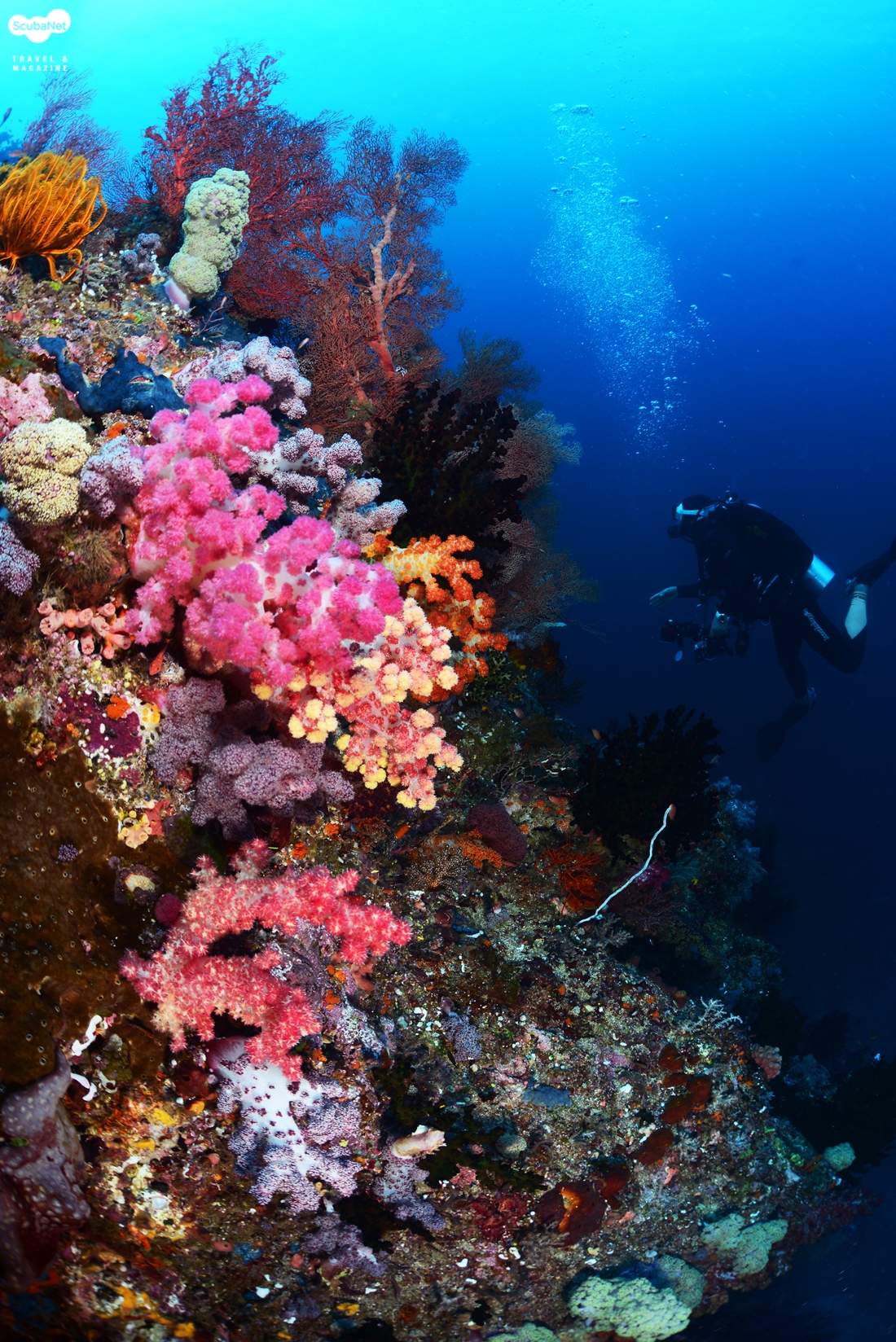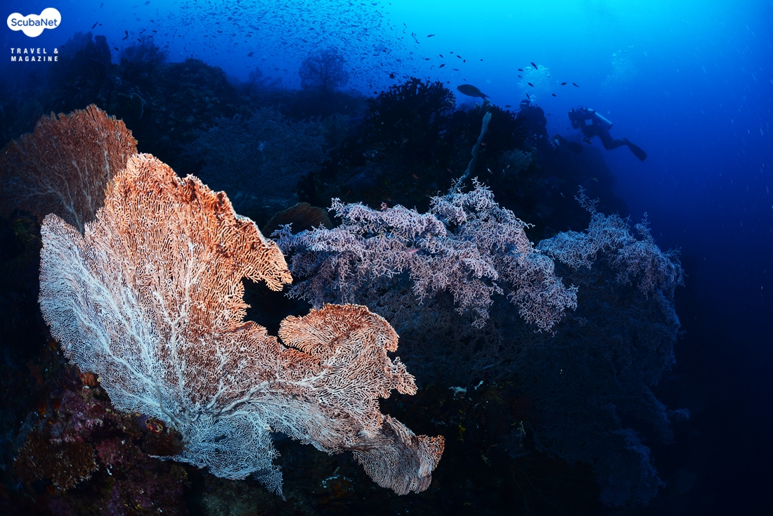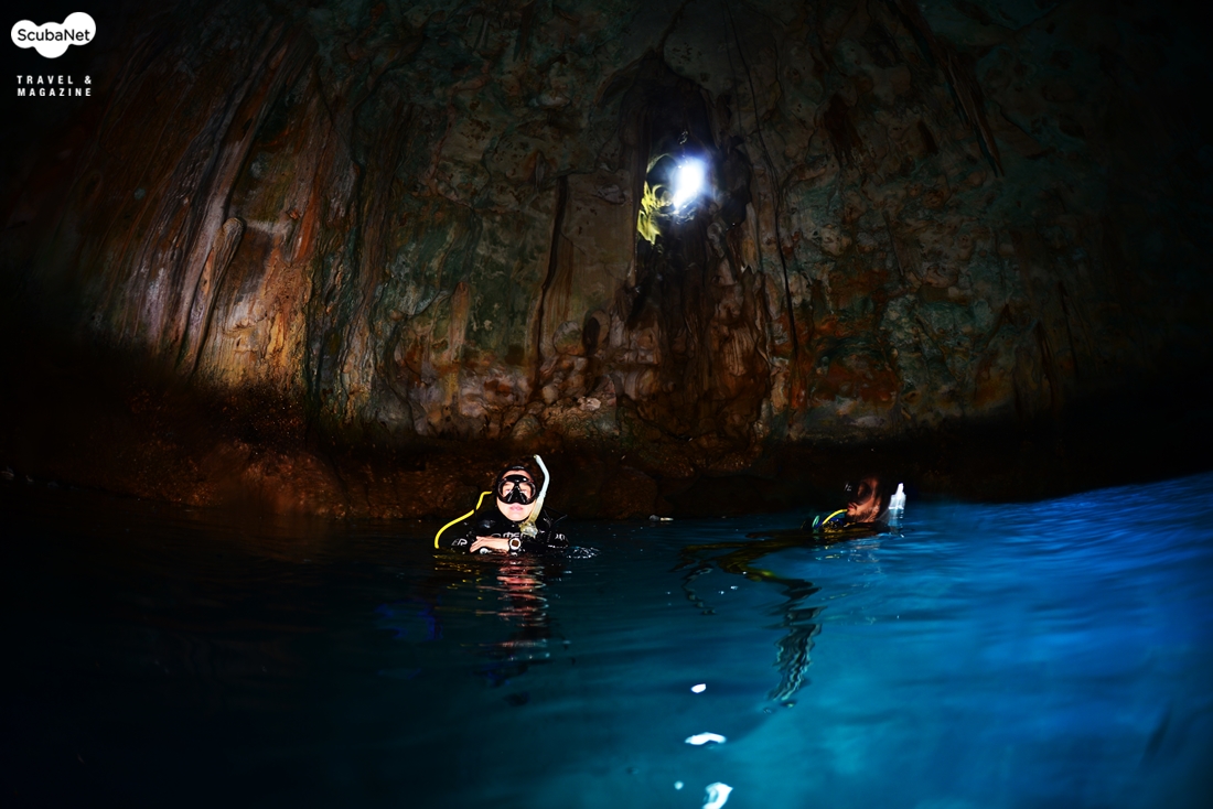 오버행의 천정에서 자라는 블랙코랄과 부채산호를 앞에 두고, 바깥 쪽으로 보이는 푸른 물을 배경으로 다이버들이 지나가는 모습을 촬영하는 것으로 포인트의 분위기를 살려보았다.