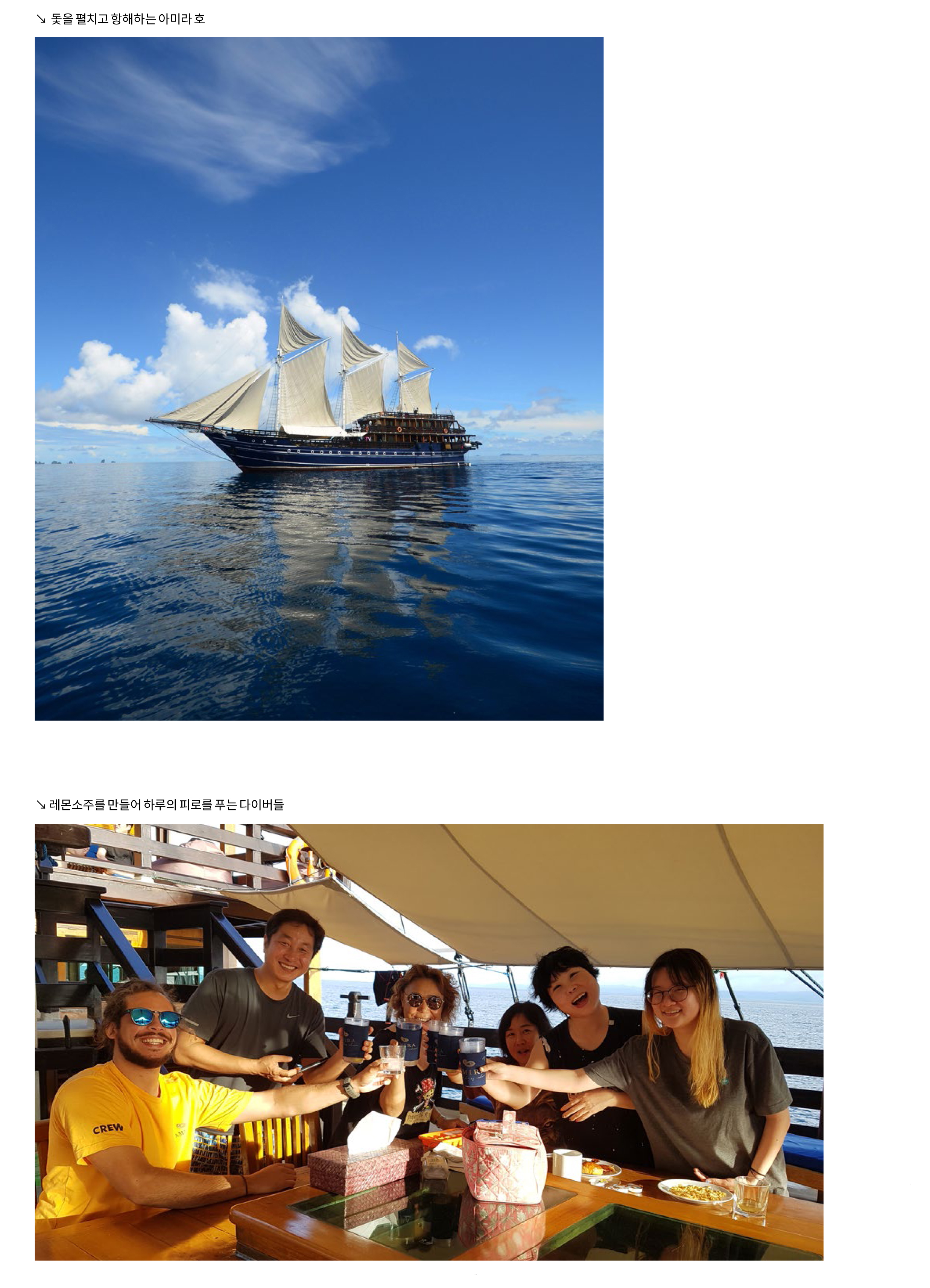 다이빙을 마치고 돌아오면서 돛을 모두 펼치고 사진을 찍게 해주었을 때 다이버들은 정말로 좋아했는데 배 사진을 촬영해 자랑스럽게 간직하고 싶었기 때문일 것이다. 투어를 기획한 필자 또한 뿌듯한 마음을 감출 수 없었다.