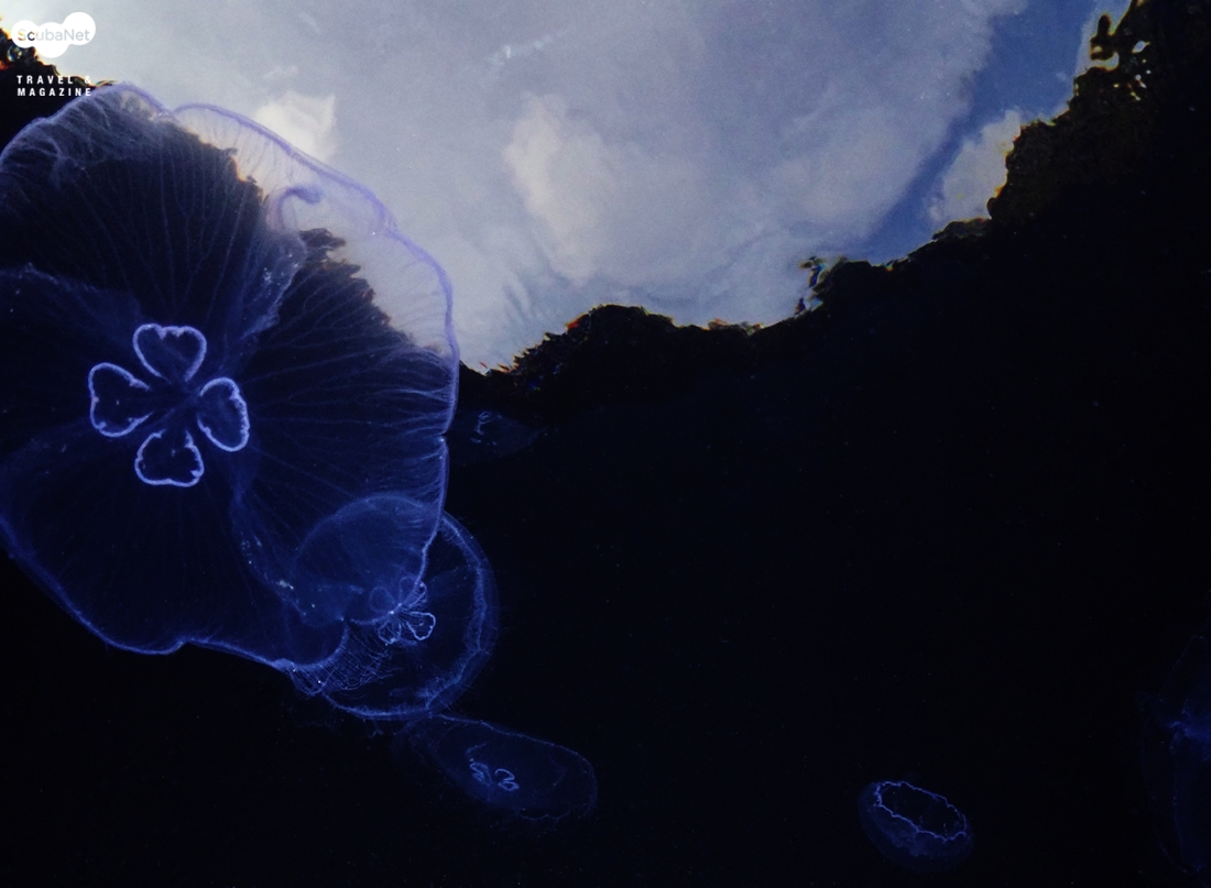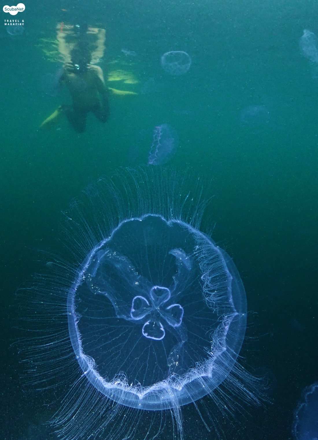 해파리호수에서 스노클링을 하는 다이버와 실처럼 가는 촉수들이 있는 해파리