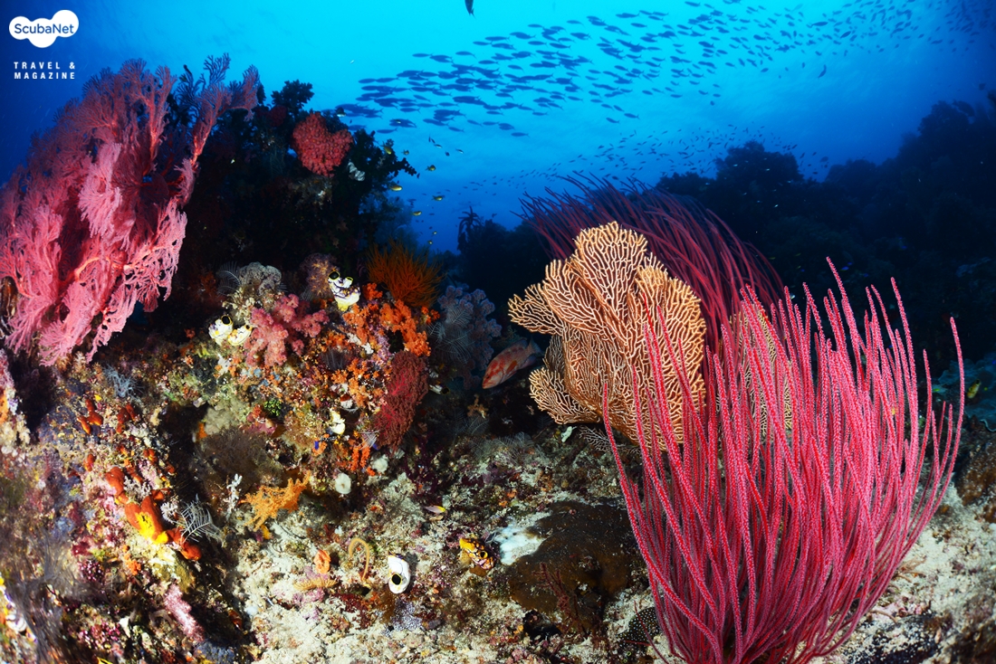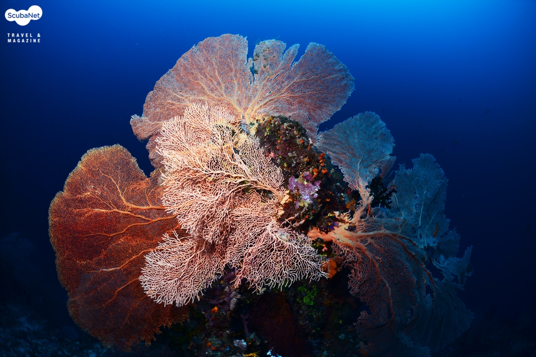 바위 아래의 스윔스루에 자리잡은 부채산호와 연산호 군락