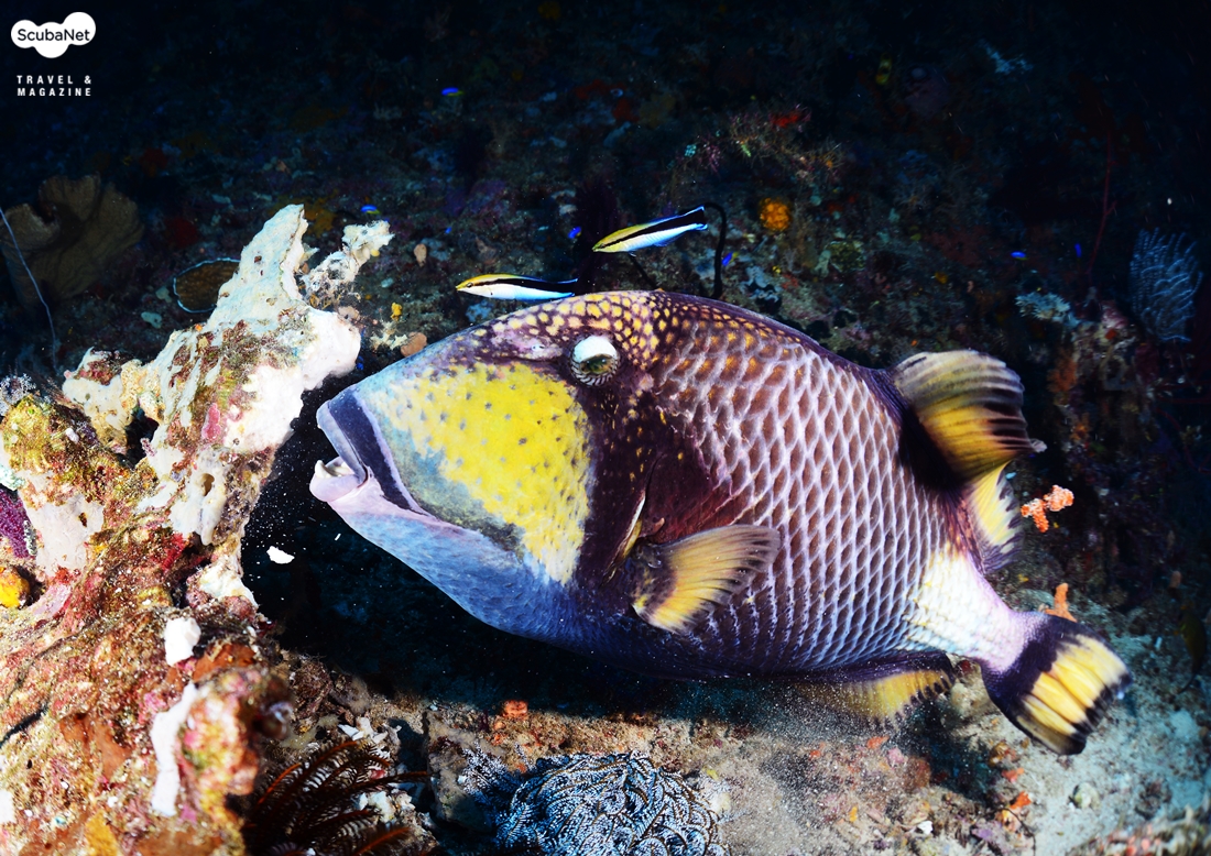 웨딩케익은 바위의 모양이 웨딩케익 처럼 층을 이루고 있는 곳이다. 오버행과 플랫폼을 따라 노란색의 부채산호들이 화려하게 자리잡고 있었으며, 월에는 넓은 부채산호와 블랙코랄들이 무성하게 자라고 있었다. 청소놀래기들의 청소서비스를 받는 와중에도 산호를 뜯으며 부지런히 먹이활동을 하는 자이언트 트리거피쉬를 만났는데 다이버가 가까이가도 전혀 신경도 쓰지않고 제 할 일만 하고 있었다. 덕분에 아주 가까이 붙어서 클로즈업 촬영을 할 수 있었다.