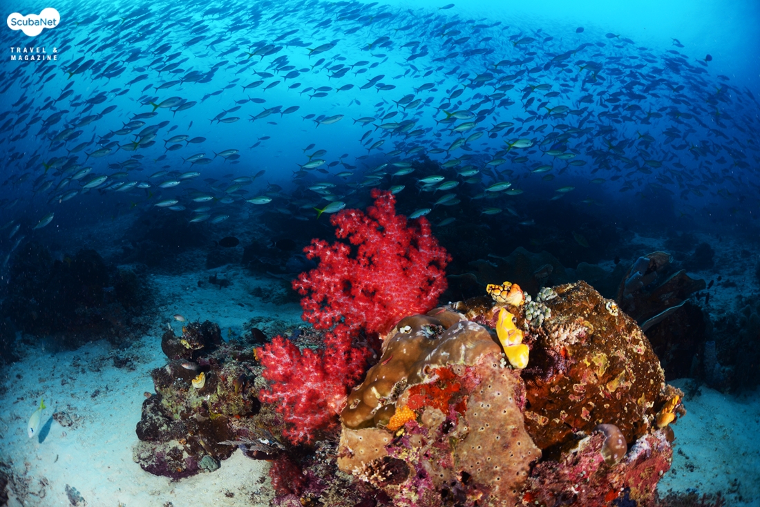 탱크락은 누디락과 수중에서 이어지는 포인트였다. 다시금 조류가 살아나면서 수중은 다시 평상시의 멋진 모습을 되찾아가고 있었다. 거대한 부채산호들의 군락과 덩치 큰 나폴레옹피쉬가 다이버들을 설레게 만들었다. 조류가 그렇게 강하지 않아서 섬의 뒤편으로 갔다가 다시 돌아오니 얕은 수심에서는 환상적인 파티가 열리고 있었다. 빨라지는 조류를 타고 멸치 무리가 수면의 얕은 층에서 활발하게 먹이 활동을 하고 있었고, 이들을 먹으려는 옐로우스팟트레발리와 레인보우런너들이 몰려다니다가 수면이 부글거릴 정도로 튀어오르기 시작했다. 사진과 동영상으로 이들의 파티를 촬영하고 있는데 덩달이 심장이 두근거릴 정도였다. 직접 보지는 못했지만 조류를 맞받는 더 앞쪽에서는 모불라레이들이 멸치들을 사냥하고 있었다고 한다. 꼭 보고 싶은 장면이었는데 떼를 못맞춘 것 같아 아쉬웠다. 다시 한번 미술을 찾아와야 하는 이유가 생겼다.