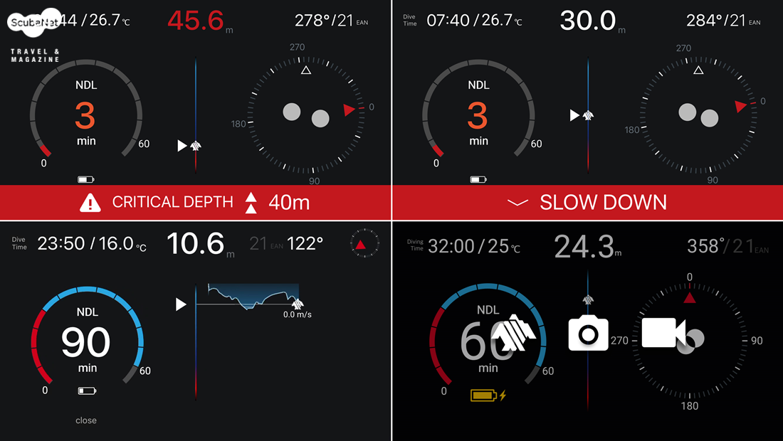최근에 출시되고 있는 다이빙 컴퓨터처럼 딥스탑 기능, 안전정지, 상승속도 표시, 잔여질소시간표시, 산소중독, 최고수심경고, 비행금지시간 표시 등의 기능을 모두 수용하고 있다.