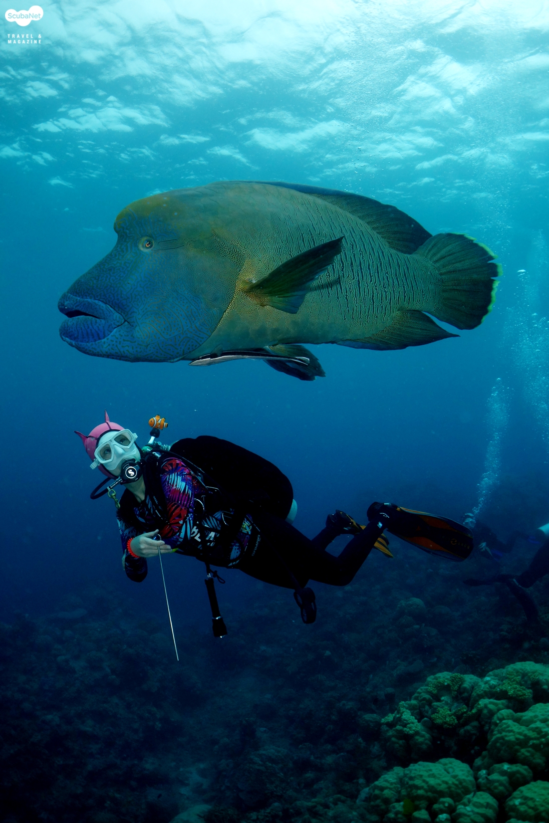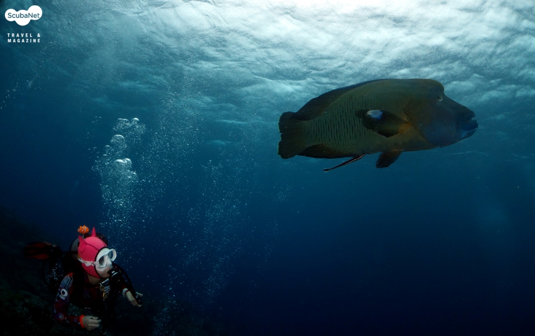 거대한 나폴레옹피쉬가 다이버들 가까이 어슬렁거렸다