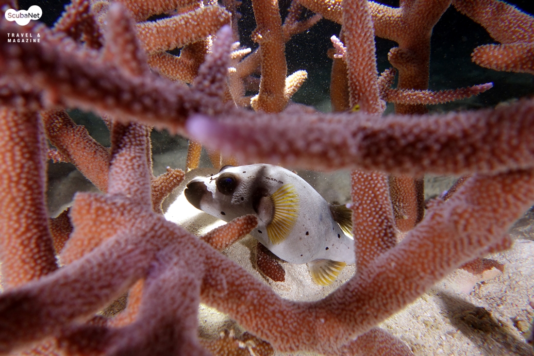 산호 속에 몸을 숨기고 있는 푸퍼피쉬