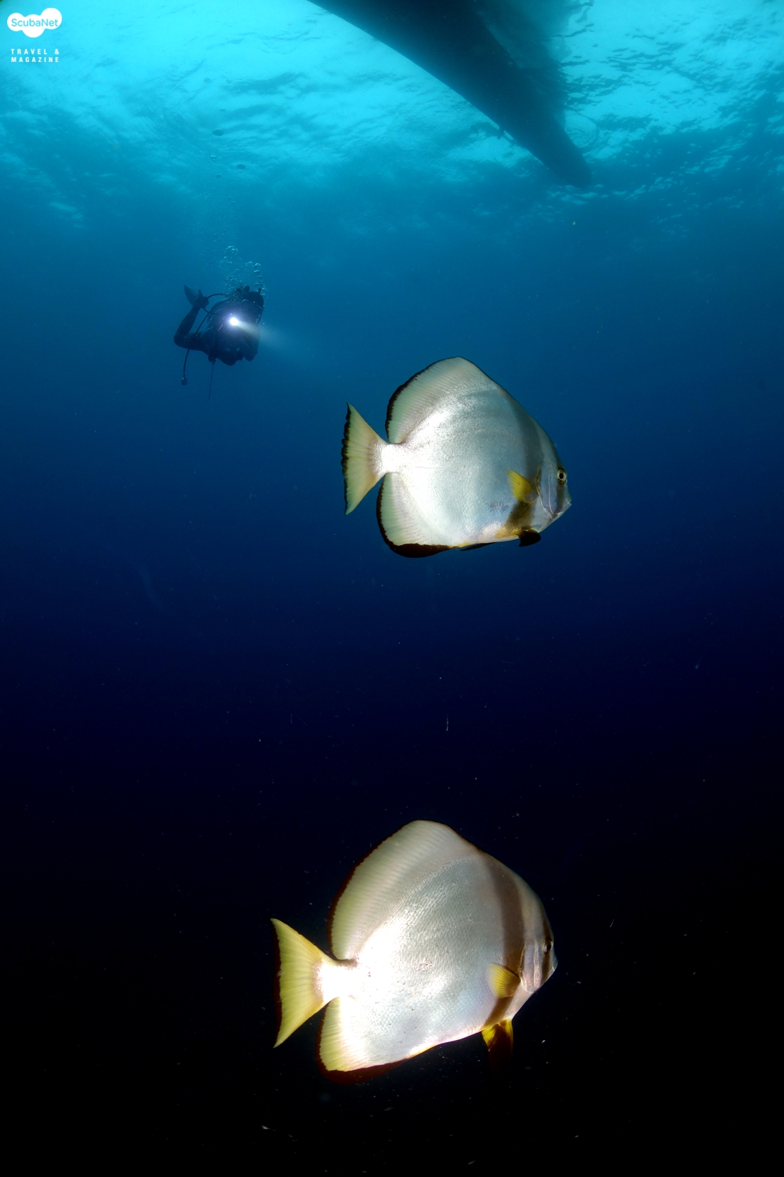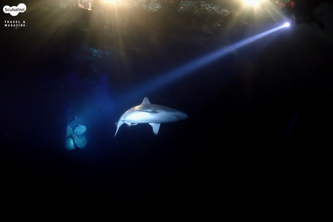 야간 다이빙에서 배의 불빛을 보고 몰려든 물고기들을 노리는 그레이리프 상어