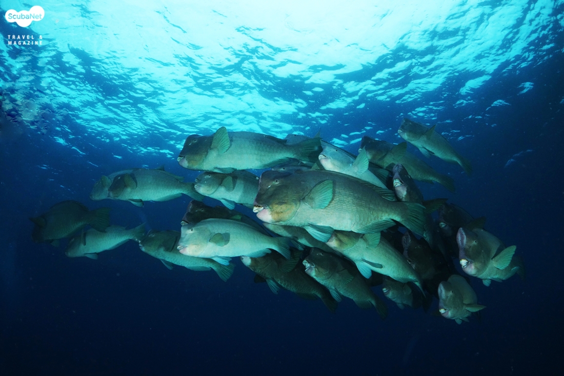 덩치 큰 범프헤드 패롯피쉬들이 무리지어 돌아다니는 모습