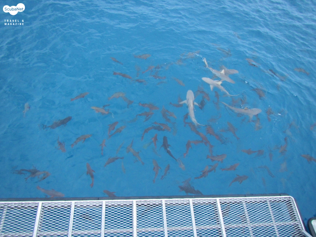 배 뒤쪽에 모여 있는 상어들과 물고기들