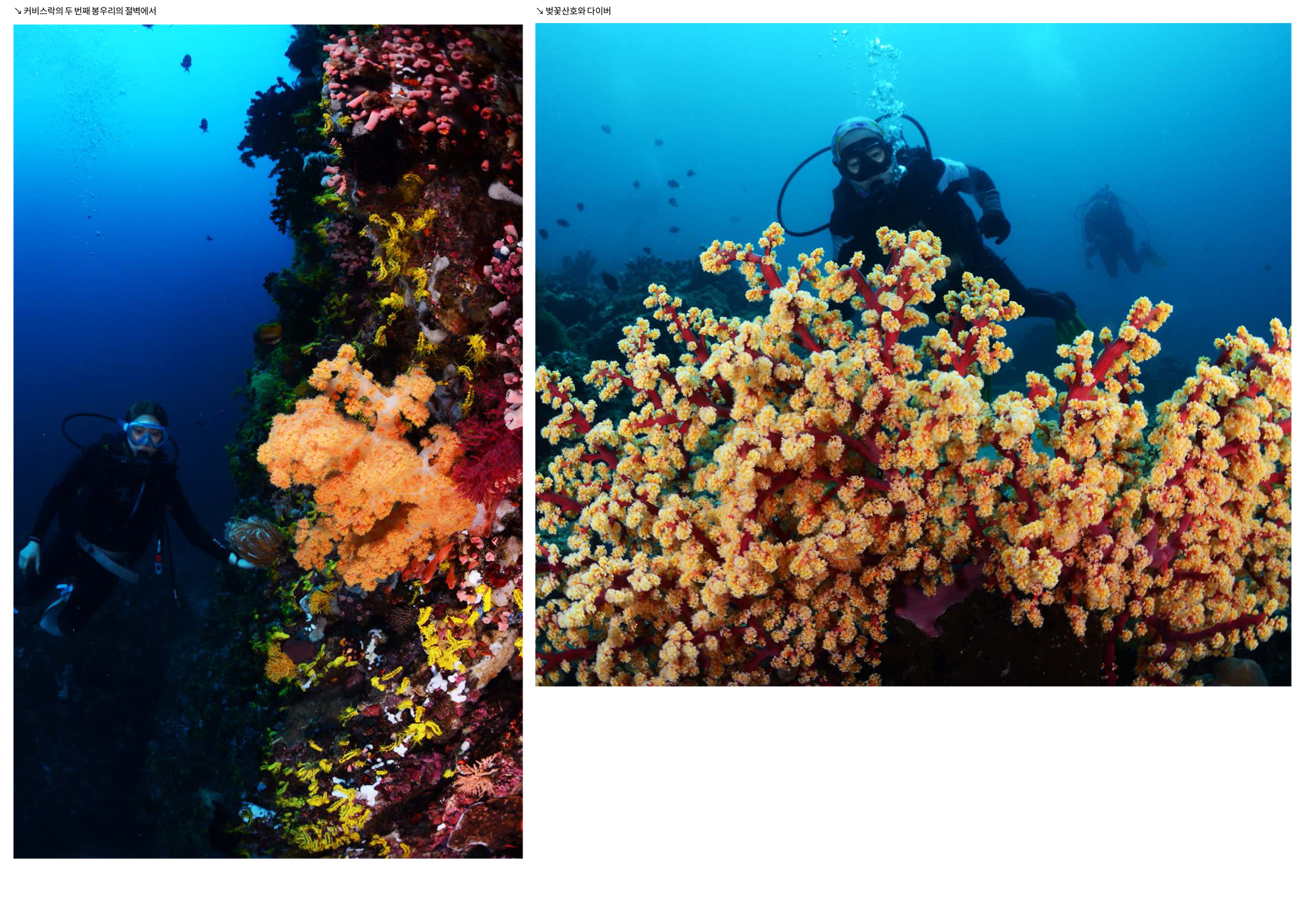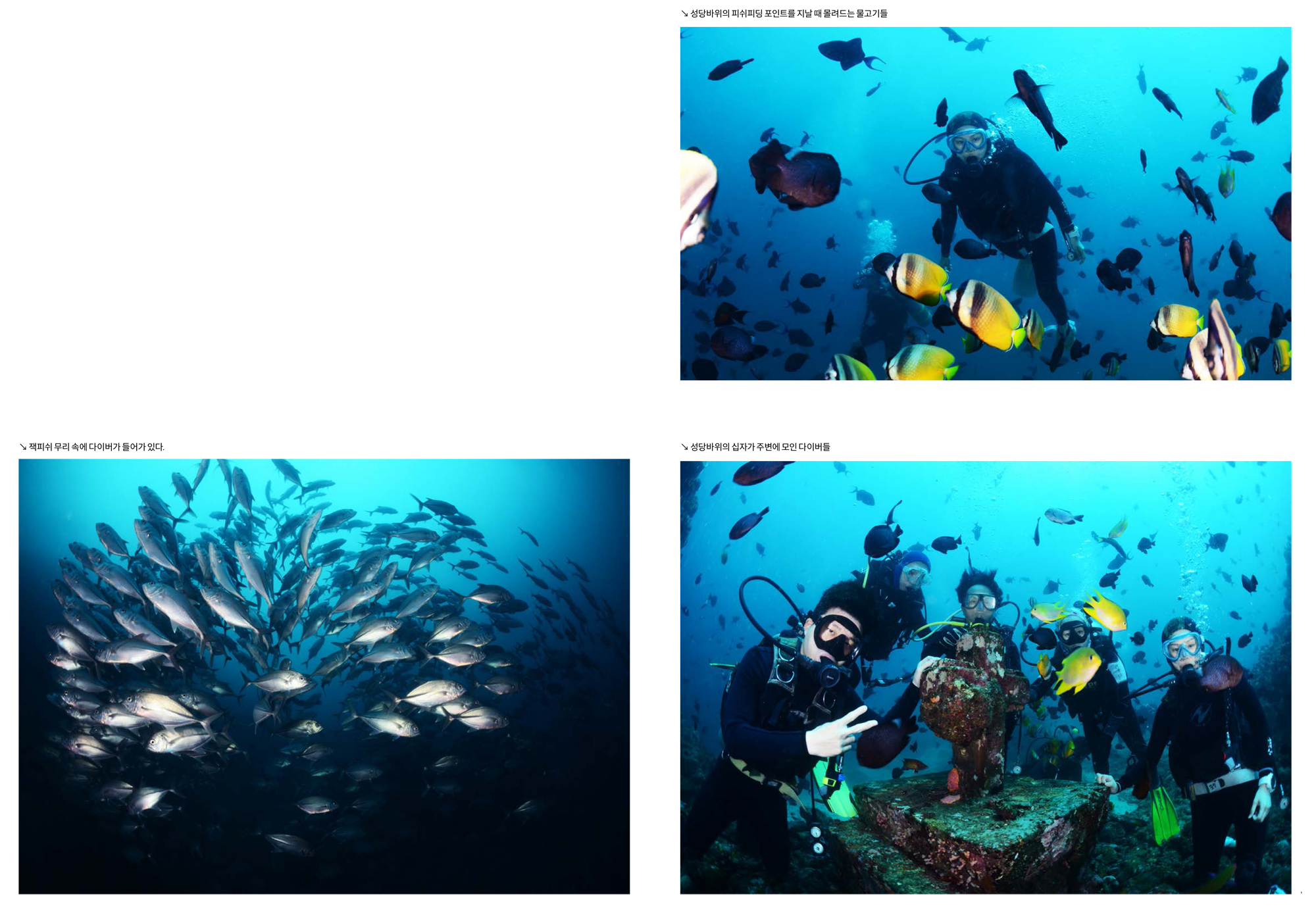 두 번째 다이빙은 성당바위 포인트에서 입수하였다. 조류가 약간 있었지만 다이버들은 성당바위에 있는 십자가까지 무사히 도달할 수 있었고 피딩을 하지 않아도 몰려드는 나비고기와 담셀피쉬들과 함께 단체 사진도 촬영할 수 있었다. 또한 성당바위의 봉우리에서 흔하게 보이는 핑크아네모네 피쉬와 출수하는 길에 만난 노란 연산호 군체 앞에서도 기념사진을 촬영하였다. 초보 다이버들과 함께 다니다 보니 이들에게 기억에 남을 사진을 찍어주는 것이 심심치 않은 즐거움이 되었다. 하지만 자세를 잘 가누지 못하는 이들이기에 순간포착을 잘해야 했다.