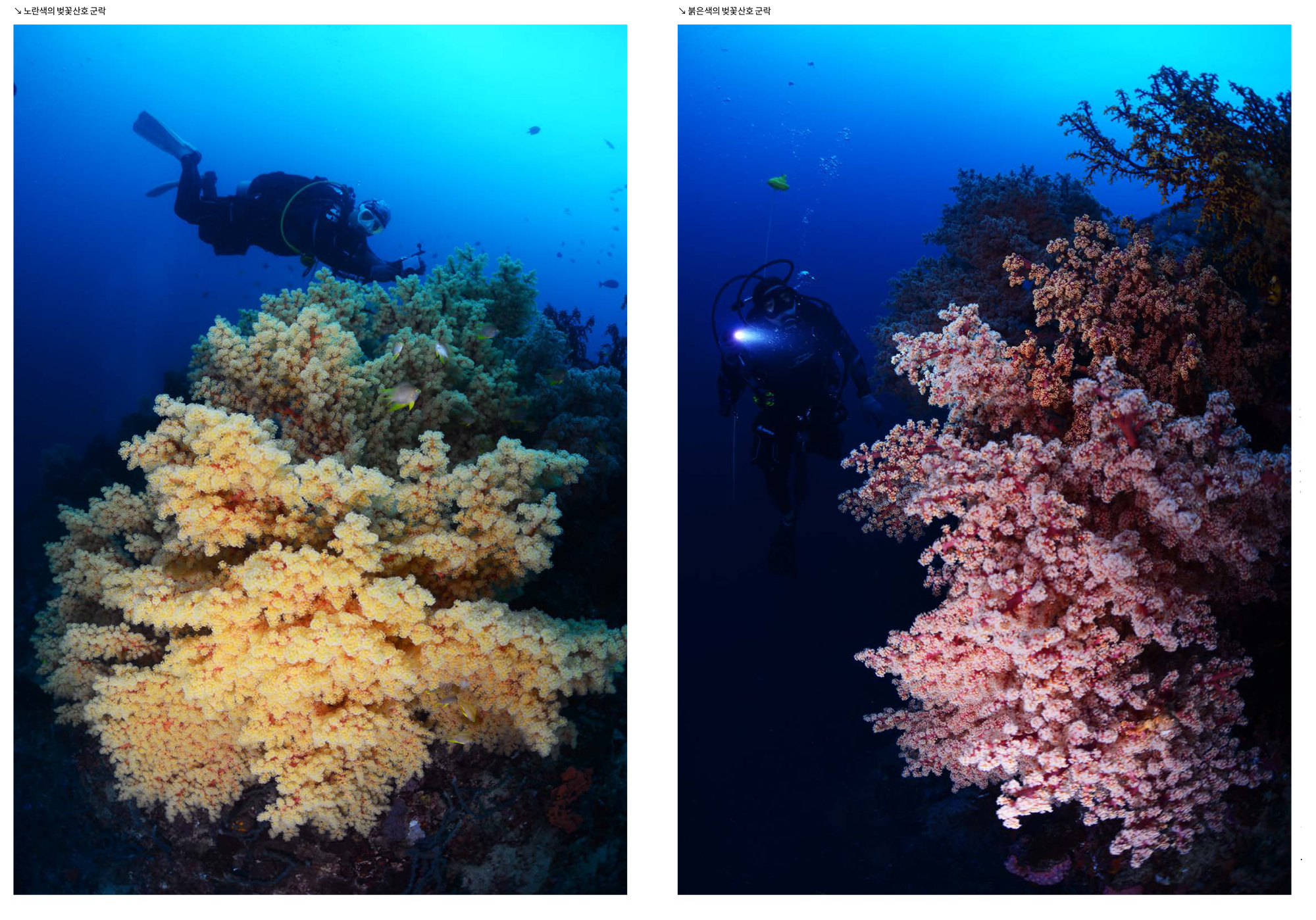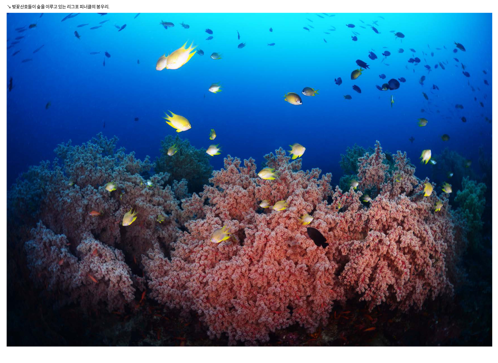 리그포 섬의 대표적인 포인트인 피너클에서 첫 다이빙을 했다. 섬 남쪽의 산호지대에서 입수하여 월을 따라 서쪽으로 이동하다 보면 월 바로 옆에 피너클이 있다. 월을 따라서는 부채산호와 벚꽃산호(Siphonogorgia godeffrogy)들이 많이 붙어 있으며, 블랙코랄도 보인다. 피너클 상단은 벚꽃산호들이 군락을 이루는데 이들이 폴립을 활짝 펼치고 있는 때는 정말 벚꽃이 활짝 핀 정원에 들어온 느낌이다. 끊임없이 움직여야 하는 초보다이버들의 속성 때문에 타이밍에 맞춰 멋진 사진을 잡아내는 것은 쉽지 않았지만 그래도 기념 사진들은 얻을 수 있었다. 리프 위로 돌아오는 길에는 군데군데 자리잡은 말미잘과 아네모네피쉬들도 구경할 수 있었다.