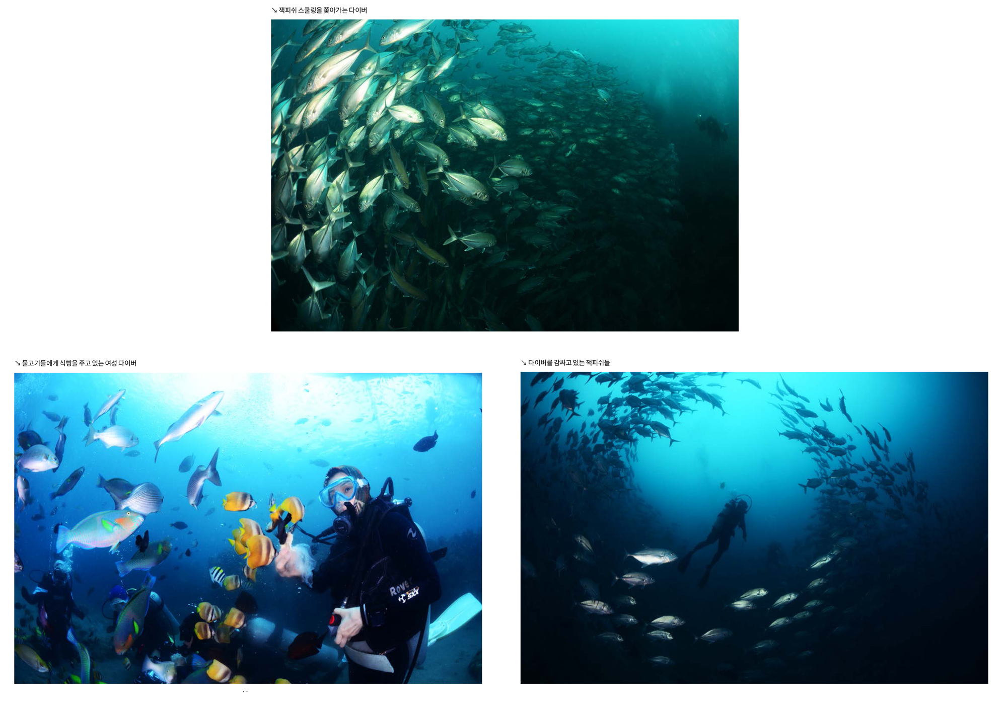 다음 다이빙으로는 최근 잭피쉬가 다시 돌아왔다는 다이브엔트렉 하우스리프로 갔다. 2개의 십자가와 마리아상 그리고 피쉬피딩 포인트가 있어서 초보자들에게는 안성맞춤인 곳이다. 첫 십자가가 있는 바위 아래의 작은 동굴 속에 모여 있는 카디널피쉬 무리가 사진을 촬영하기에 좋은 곳이다. 구석진 곳의 마리아 상은 조명을 잘 넣어서 촬영하면 멋진 작품을 만들 수도 있을 것이다. 두 번째 십자가가 있는 곳으로 이동하는 중에 잭피쉬 스쿨링을 만났다. 무리의 크기는 예전에 트윈락에 있는 잭피쉬 무리만큼은 되는 듯했다. 잭피쉬는 다이버들을 휘몰아 회오리를 만들기도 하며 한참을 놀다가 깊은 수심으로 내려갔다. 돌아오는 길에 가이드 크리스가 준비해준 식빵으로 피쉬피딩을 하며 다이빙을 마무리했는데 다이버들은 모두 만족해 했다.