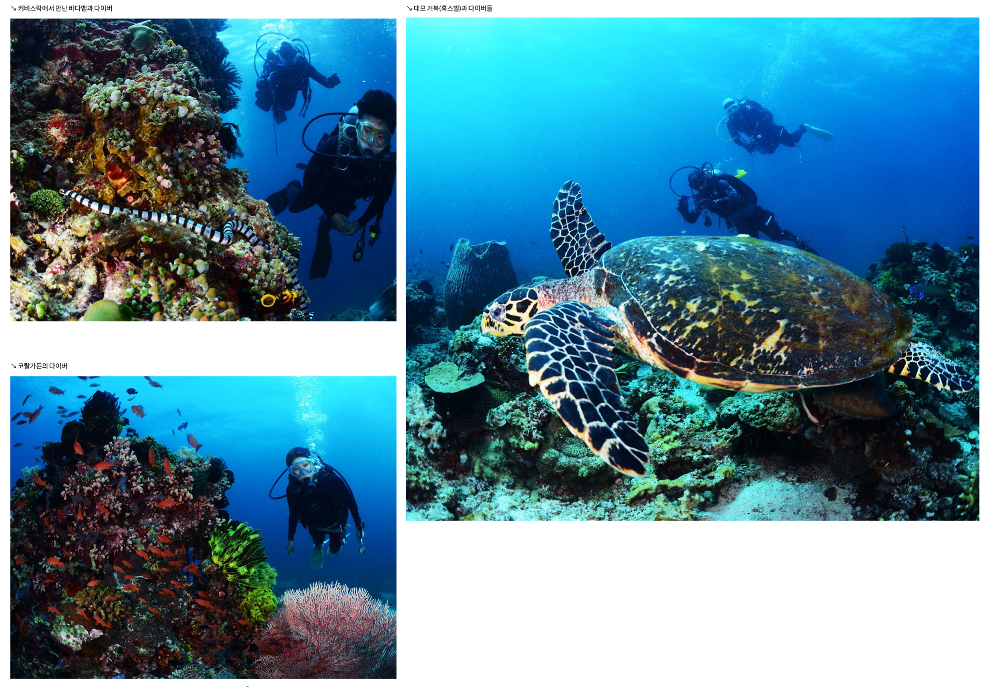 세 번째 다이빙은 솜브렐로 섬의 코랄가든에서 진행하였다. 다이버들의 실력이 된다면 베아트리체를 가면 좋겠지만 코랄가든만 해도 충분히 괜찮은 곳이었다. 항아리해면과 안티아스 무리들 그리고 한가롭게 먹이를 먹고 있는 바다거북 등이 다이버들을 즐겁게 해주었다. 조류도 별로 없었기에 코랄가든의 얕은 수심대를 한바퀴 돌면서 예쁜 인증샷을 남기는데 몰두했다. 초보자들과 함께 하는 다이빙은 난이도가 높지 않아 말 그대로 힐링이 되는 다이빙이었다.