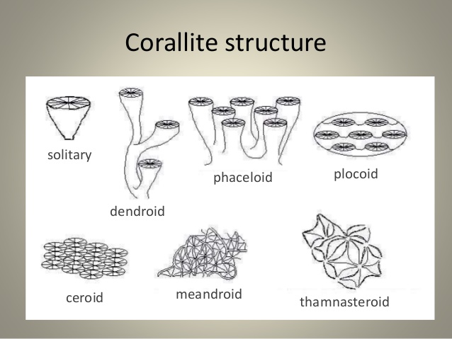 2단계: 군체 형성 타입과 산호석의 형성속 단위의 분류를 결정하는 핵심 특징의 하나는 산호석이 어떻게 성장하는지, 전체 군체가 어떻게 형성되는 지이다. 산호 폴립들 사이의 공간을 보고, 산호석 벽의 존재와 벽이 어떻게 형성되었는지 파악한다. 산호석은 공통 벽(ceroid)을 나누어 가지거나, 각각의 산호석이 스스로 뚜렷한 벽(plocoid)을 가질 수도 있다. 일부 산호들은 불분명한 벽을 갖고 있는데 벽이 거의 없다는 것을 의미한다. 또한 벽들은 능선과 계곡들을 만들 정도로 솟아오를 수 있다. 개별적인 벽을 가지고 있는 파셀로이드 phaceloid 형은 산호석이 공통 중심에서 자라기 시작하여, 자신만의 벽을 형성한다.