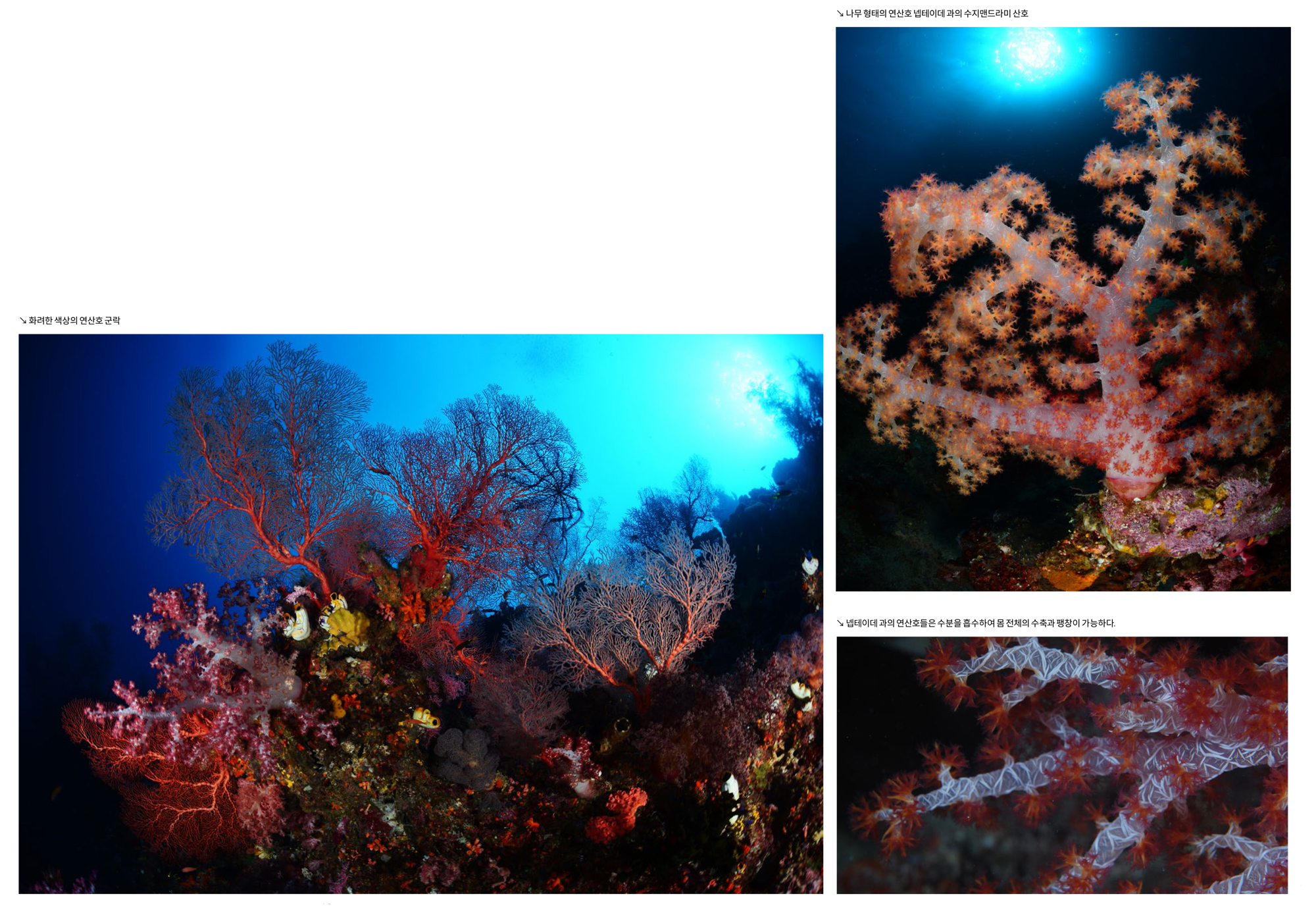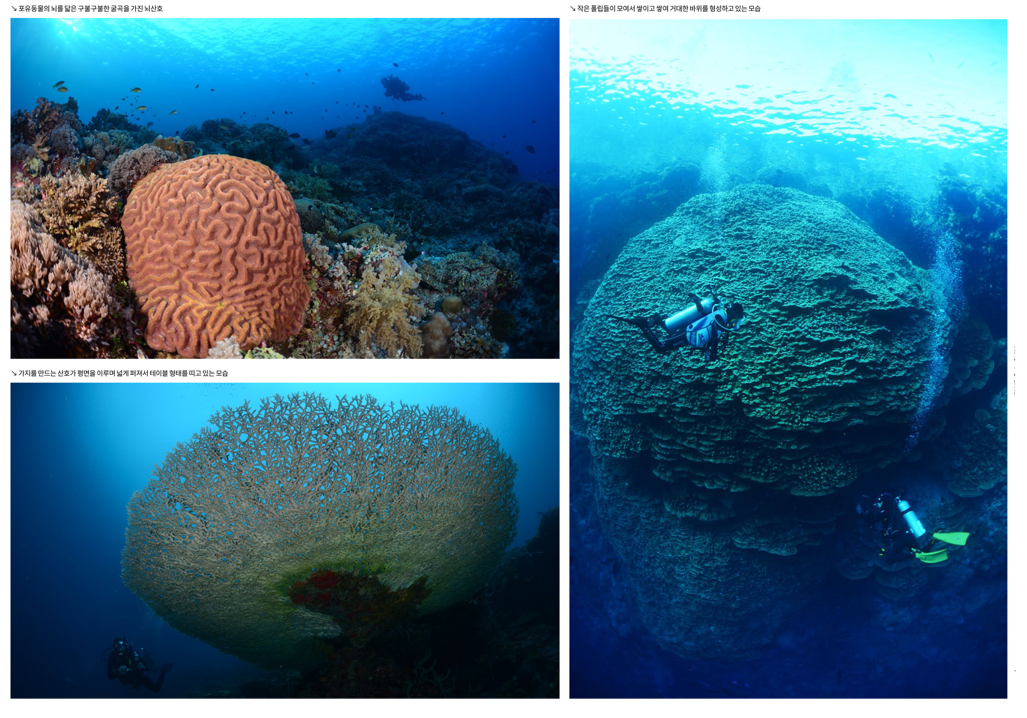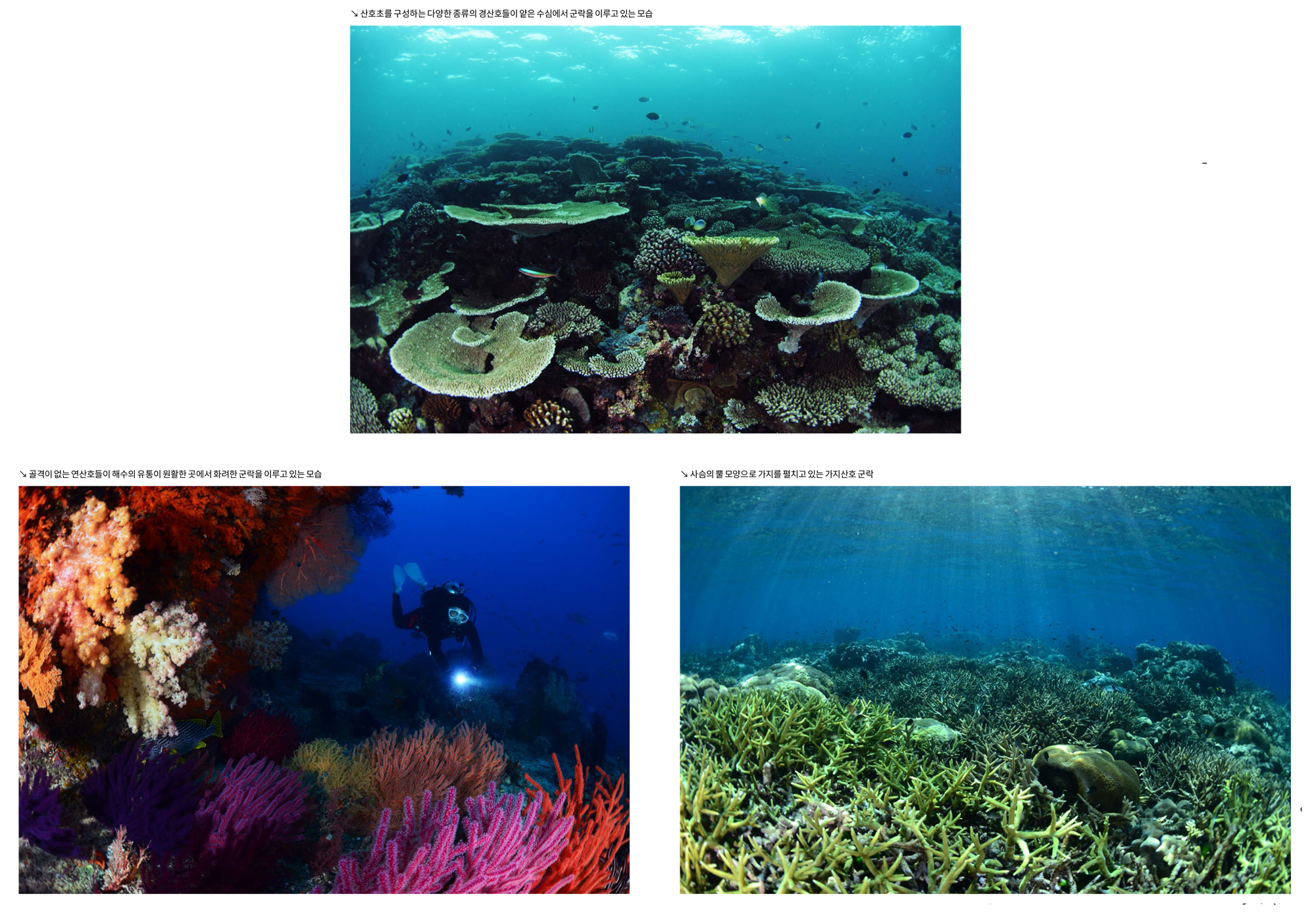 다양한 종류의 산호들과 산호초 생물들이 어우러져 복잡한 생태계를 이루고 있는 모습