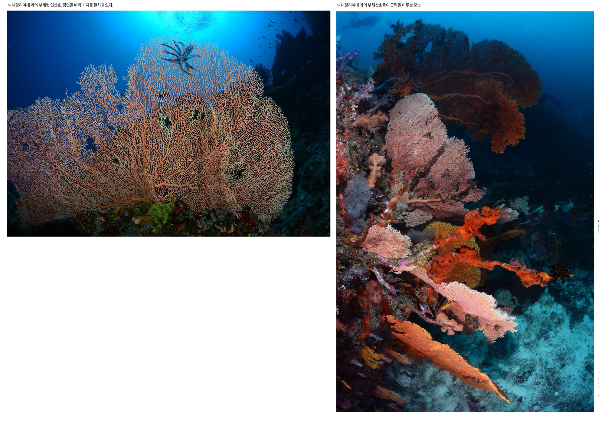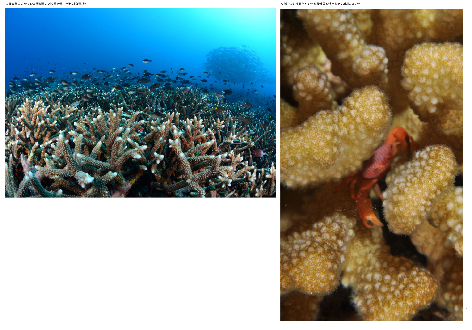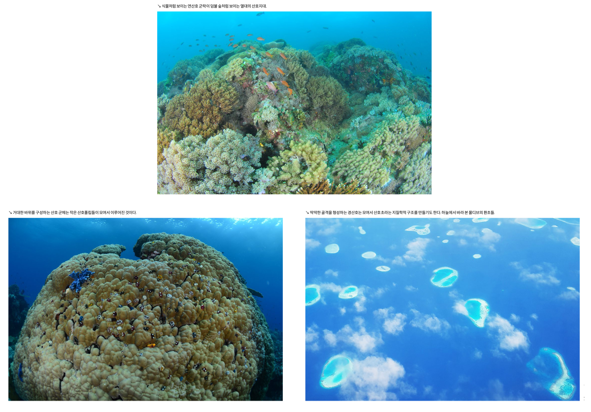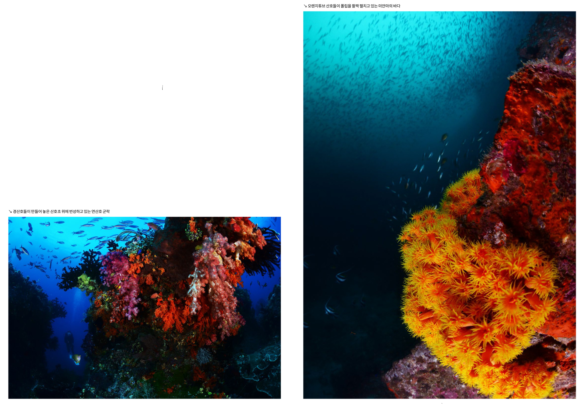 다양한 종류의 산호들과 산호초 생물들이 어우러져 복잡한 생태계를 이루고 있는 모습