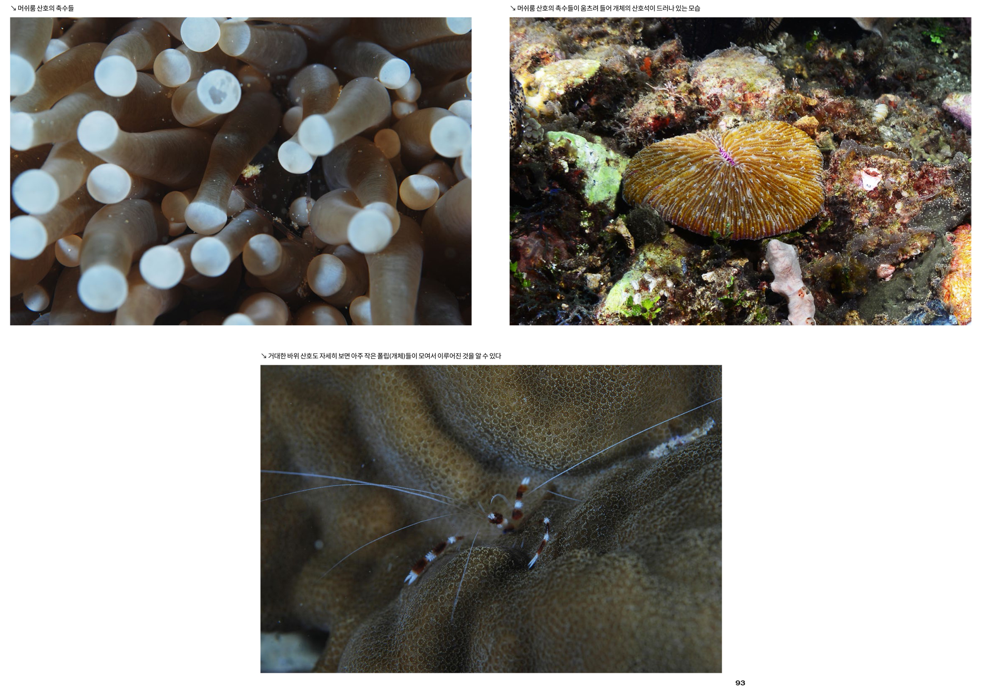 산호의 구조 우리가 열대 바다에서 만나는 산호들은 종종 바위처럼 보이기도 하지만 살아있는 동물로 번식하고, 먹고, 죽으며, 골격을 남겨서 해양의 산호초 생태계를 형성하게 해준다. 또한 일부는 식물처럼 생긴 외형을 갖기도 하지만 실제로는 동물들이다. 이 고착성 생물은 스스로 먹이를 만들 수는 없고, 작은 촉수로 먹이를 잡아 열린 입으로 쓸어 넣는다. 하나의 개체가 독립적으로 살아가는 것들 것 있지만 산호는 일반적으로 여러 개체가 모여 군체를 이루며 사는 무척추동물이다.