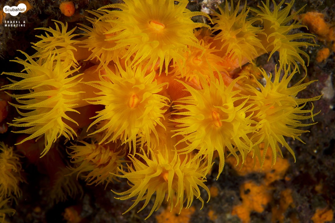 돌출된 산호석을 폴립이 뒤덮고 있는 오렌지컵 산호