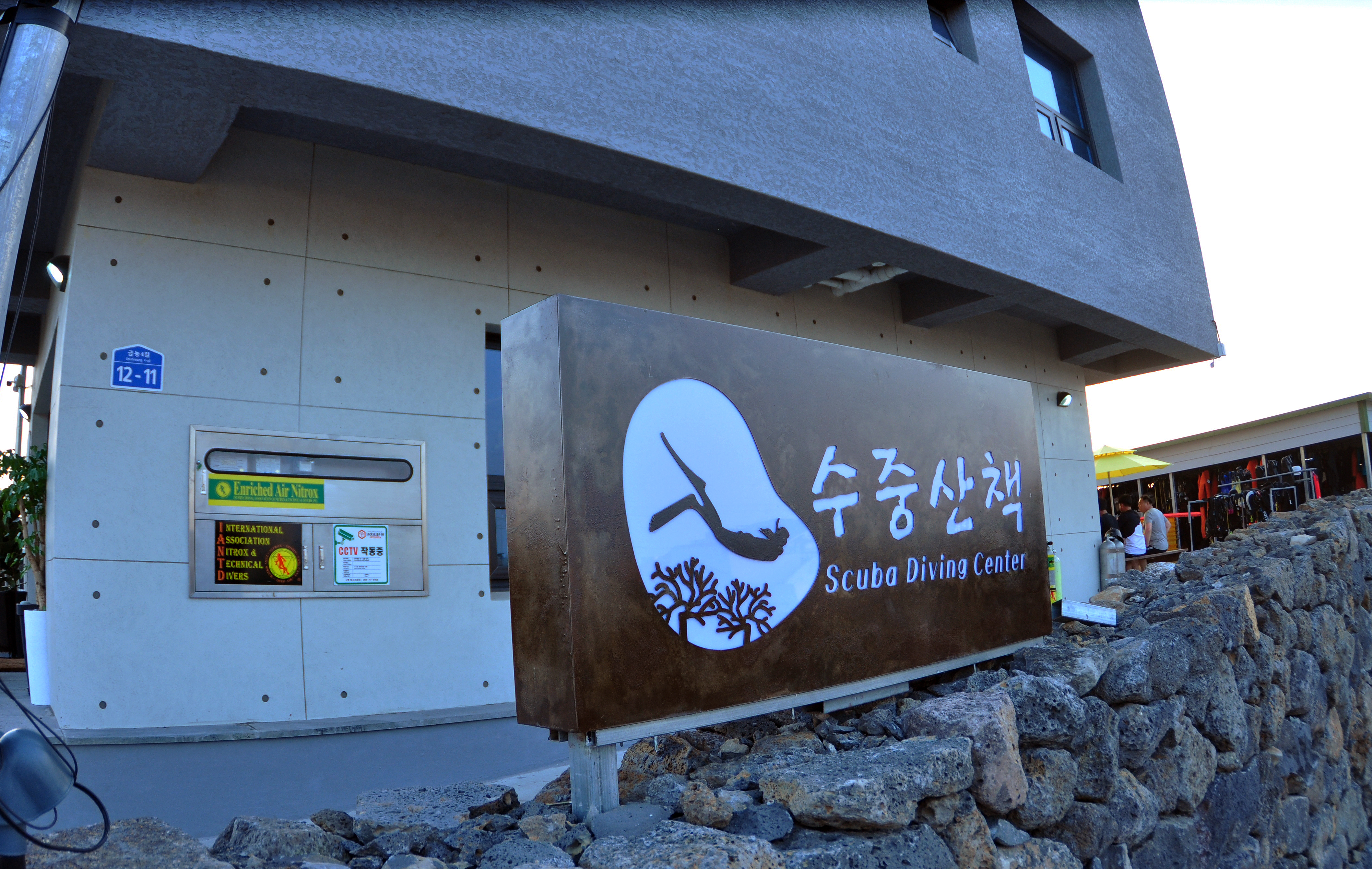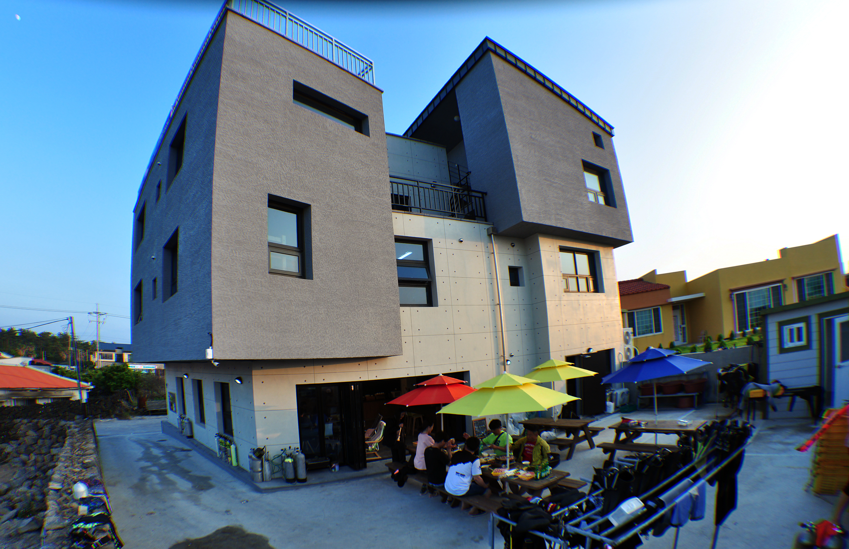 제주 수중산책 다이빙센터가 기존의 금릉마린 게스트하우스에서 나와서 신축건물을 짓고 새롭게 이전했다. 그동안 한림을 오며 가며 공사가 진행되는 중에 서너 번 방문했지만 건물을 완공하고 이전한 뒤에 다이빙 투어로 찾아가기는 처음이었다. 3층 구조로 신축된 수중산택의 건물은 독특한 외양이 깔끔하고 예뻤다. 1층에 다이브센터와 라운지가 있는데 외부의 비치 테이블과 파라솔로 자연스럽게 확장되는 구조였다. 2층과 3층은 객실로 구성되어 있는데 객실은 2인실, 3인실, 4인실, 페밀리룸 등으로 구성되어 있으며, 혼자 여행하는 다이버들을 위한 도미토리로도 이용가능하다고 한다. 건물 어디에서나 금릉리의 마을전경과 바다를 볼 수 있도록 설계되어 있어서 투숙객들에게 편안한 휴식처가 될 듯하였다.