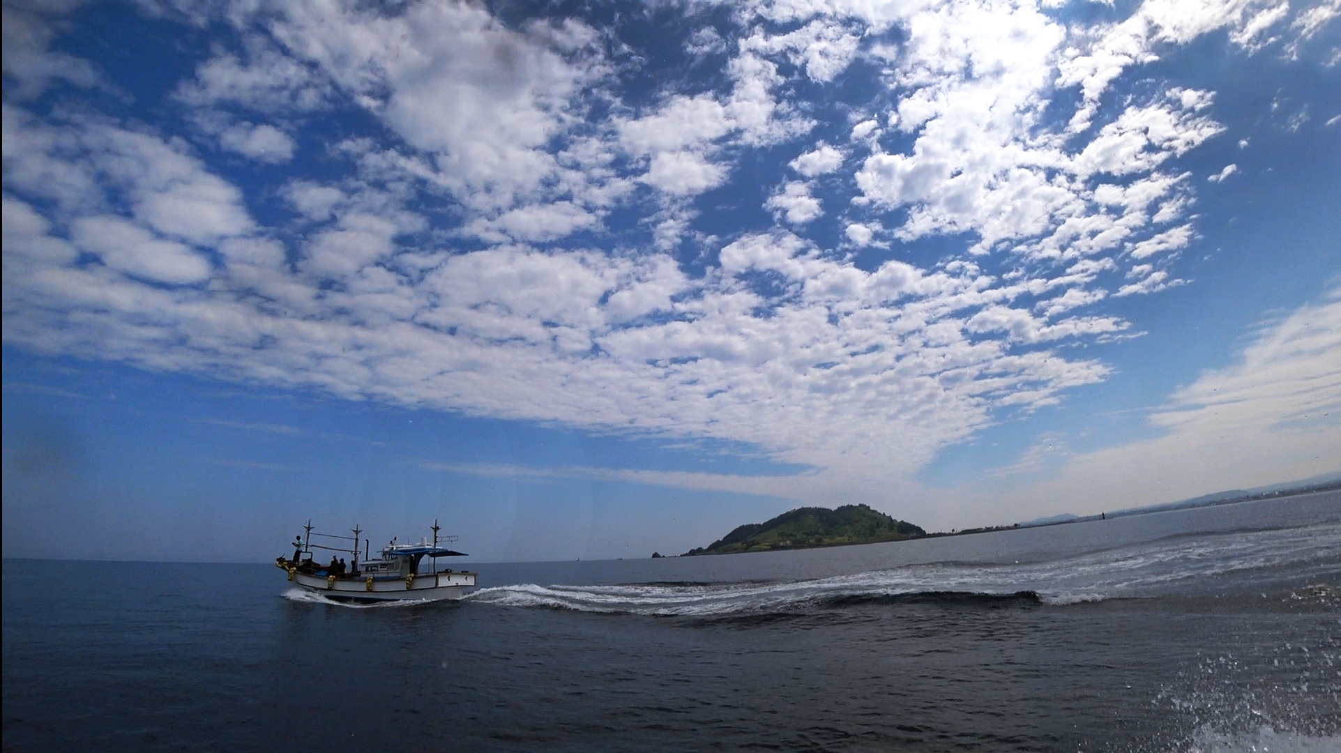 비양도 옆으로 지나가는 수중산책의 다이빙 전용선