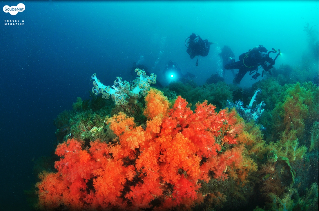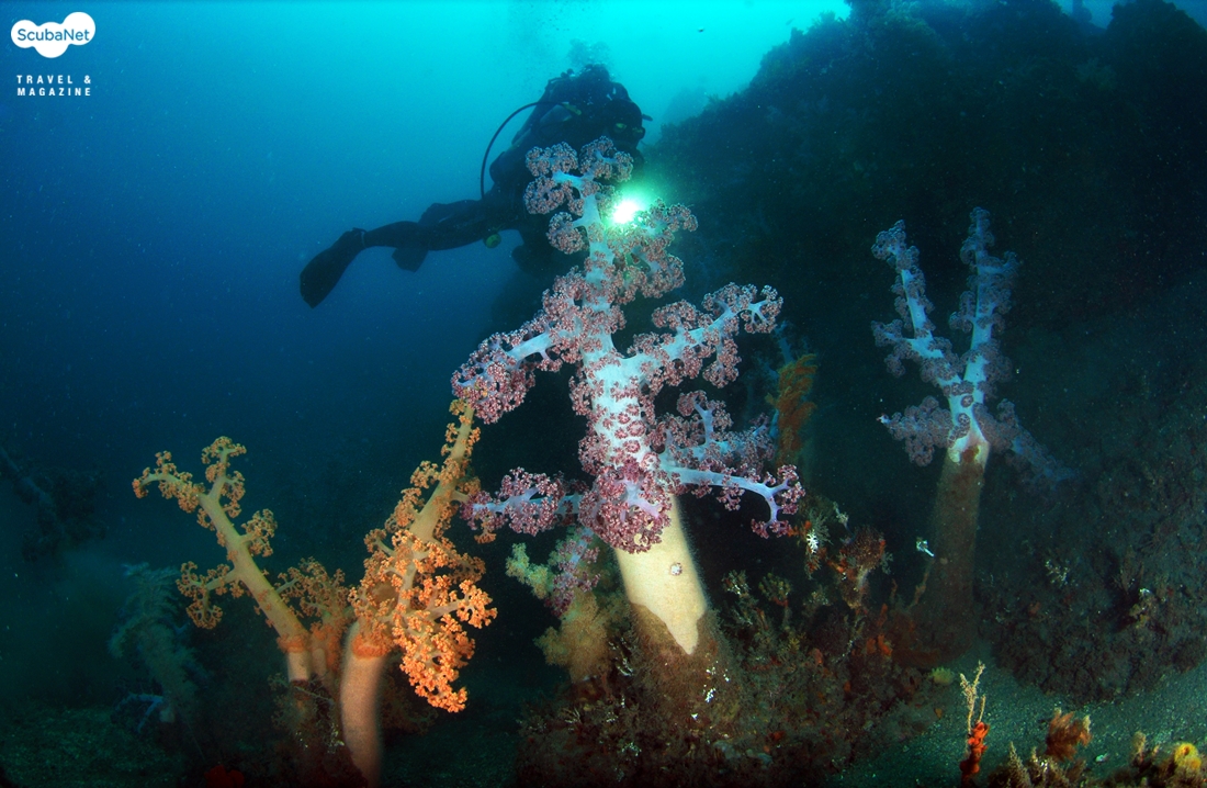 자그마한 수중 언덕을 따라 자리잡고 있는 산호들