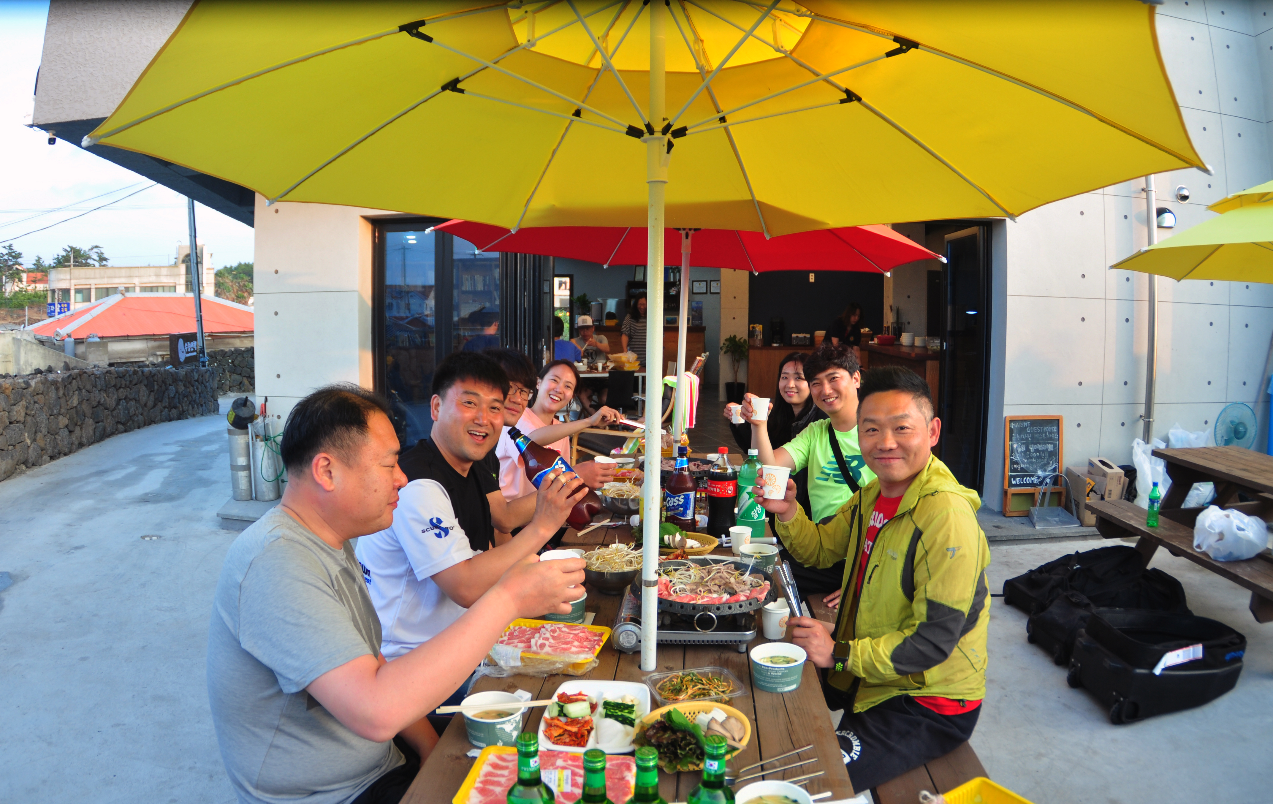 어초 내부에 부착된 가시수지맨드라미 이렇게 두번의 다이빙을 마치고 리조트로 돌아와 장비를 세척하여 정리하고 쉬고 있는데 저녁 식사를 겸한 바비큐 파티가 준비되었다. 건물 내부의 라운지와 외부의 비치파라솔 테이블까지 다이버들이 가득 자리를 차지한 가운데 고기 굽는 냄새가 리조트 전체로 번져 나갔다. 시장이 반찬이라 다이버들과 함께 그날의 수중사진도 보고, 다이빙 이야기도 하며 즐겁게 금릉의 밤을 즐겼다. 새롭게 이전한 수중산책 다이브센터는 예전과 다름없이 다이버들의 흥겨운 분위기가 가득했다.