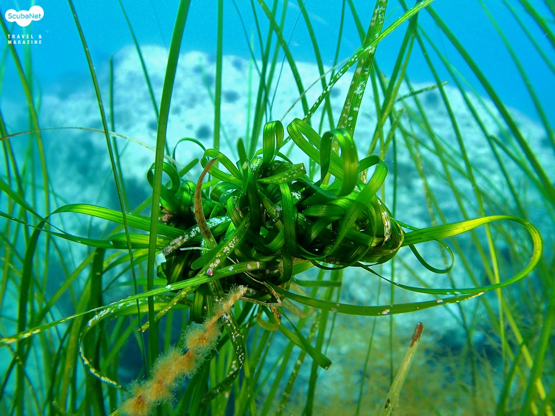 잘피의 잎들이 얽혀 있는 모습어느 가을 낙엽이 다 떨어지고 앙상한 가지만 남아 있는 나무 가지마냥 미역 줄기는 어느새 많이 녹아 없어졌다. 남은 것은 앙상한 나뭇가지처럼 손으로 건드리면 금방이라도 부러질 듯한 모양새로 나풀거리고 있었다. 간간히 지쳐가는 생명의 연장을 지루하게 이어 가듯 키 작은 모자반 역시 조금은 남아있었다. 바위 틈에 숨어서 얼핏 보면 겉모습은 무언지도 모를 만큼 잔뜩 위장한 체 스물, 스물 기어 가는 전복의 모습을 보면서 '나에게 들켜서일까?' 딱 붙어서 전혀 미동도 하지 않고 잠시 그 자리에 머물러 있다. 하얀 햇살이 물속으로 들어오면서 파란 물속에 진한 물감이라도 풀어 놓은 듯한 '잘피'의 순수한 녹색에 가만히 들여다본다. 그 곳을 터전으로 살아가는 많은 해양 생물들을 구경하면서 처음으로 잘피가 피운 '꽃'을 보고 신기해했다. 또 다른 잘피를 보니 누군가 인위적으로 리본처럼 얼기설기 엮은 모습이 있다. 누가 물속에서 이런 장난을 하였을까 생각하면서 혹시나 내가 모르는 무언가의 터전은 아닌가 또 다른 상상을 하게 된다.