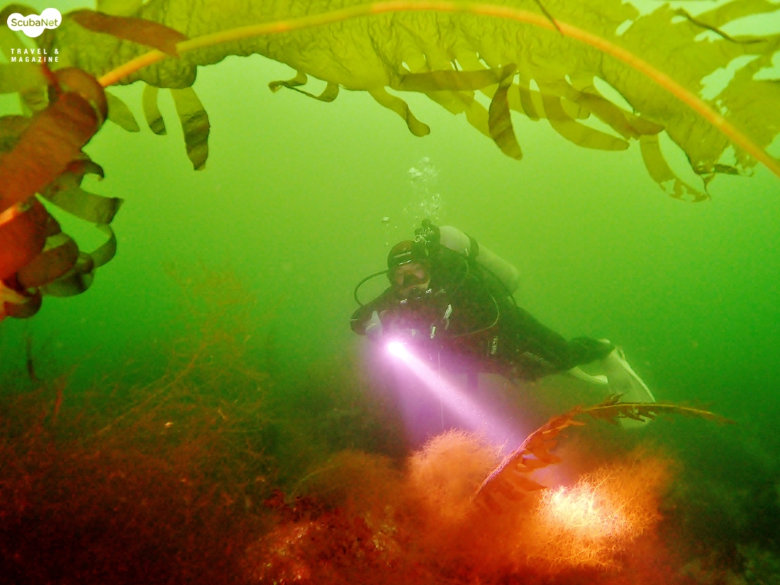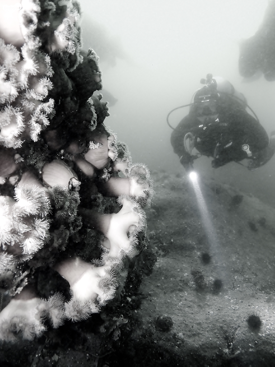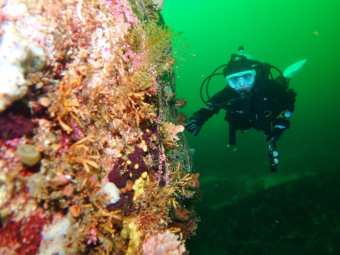 암반에 말미잘들이 화려하게 피어 있는 모습과 다이버 박용진씨 (그만큼 수온도 매우 낮았다)