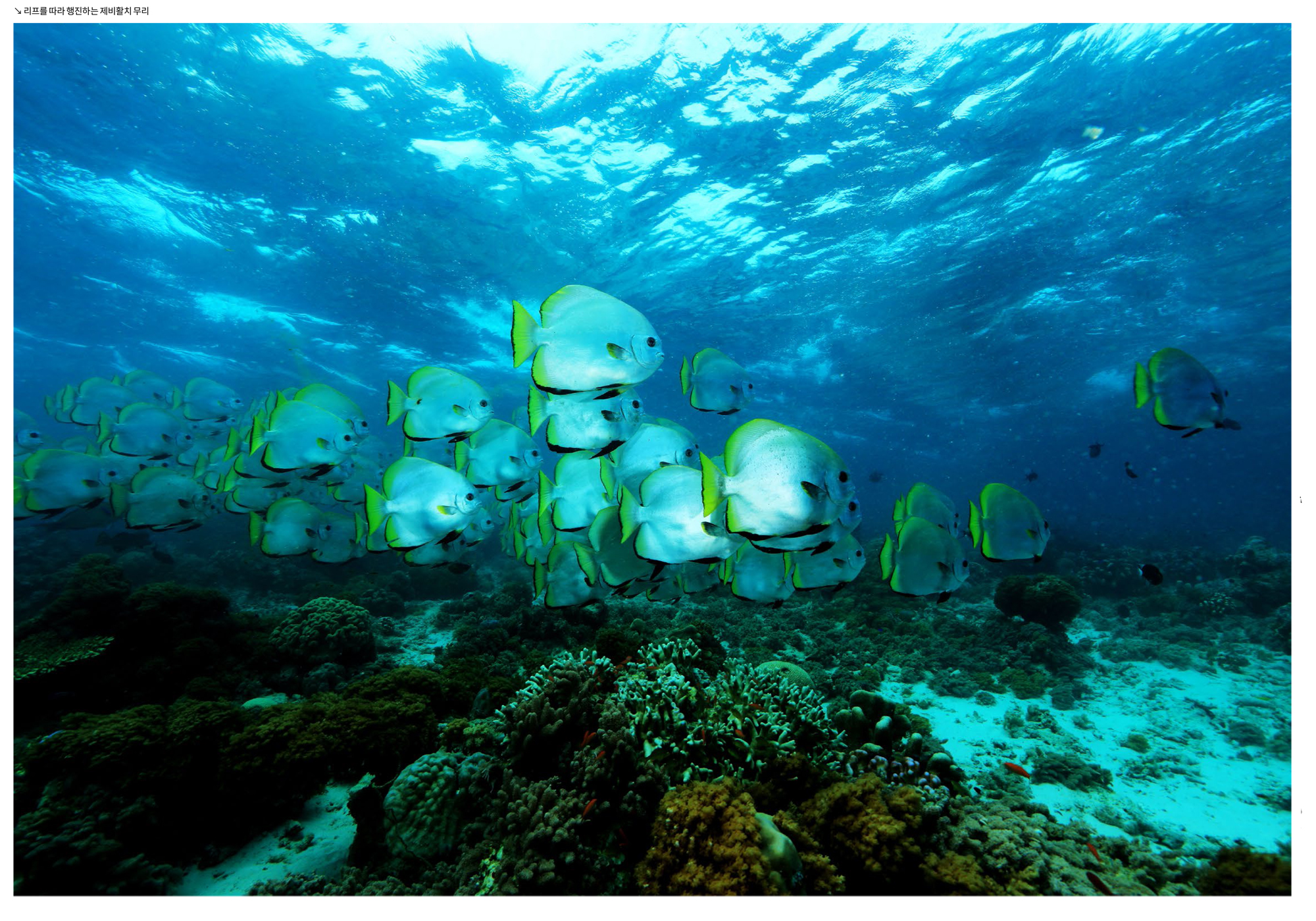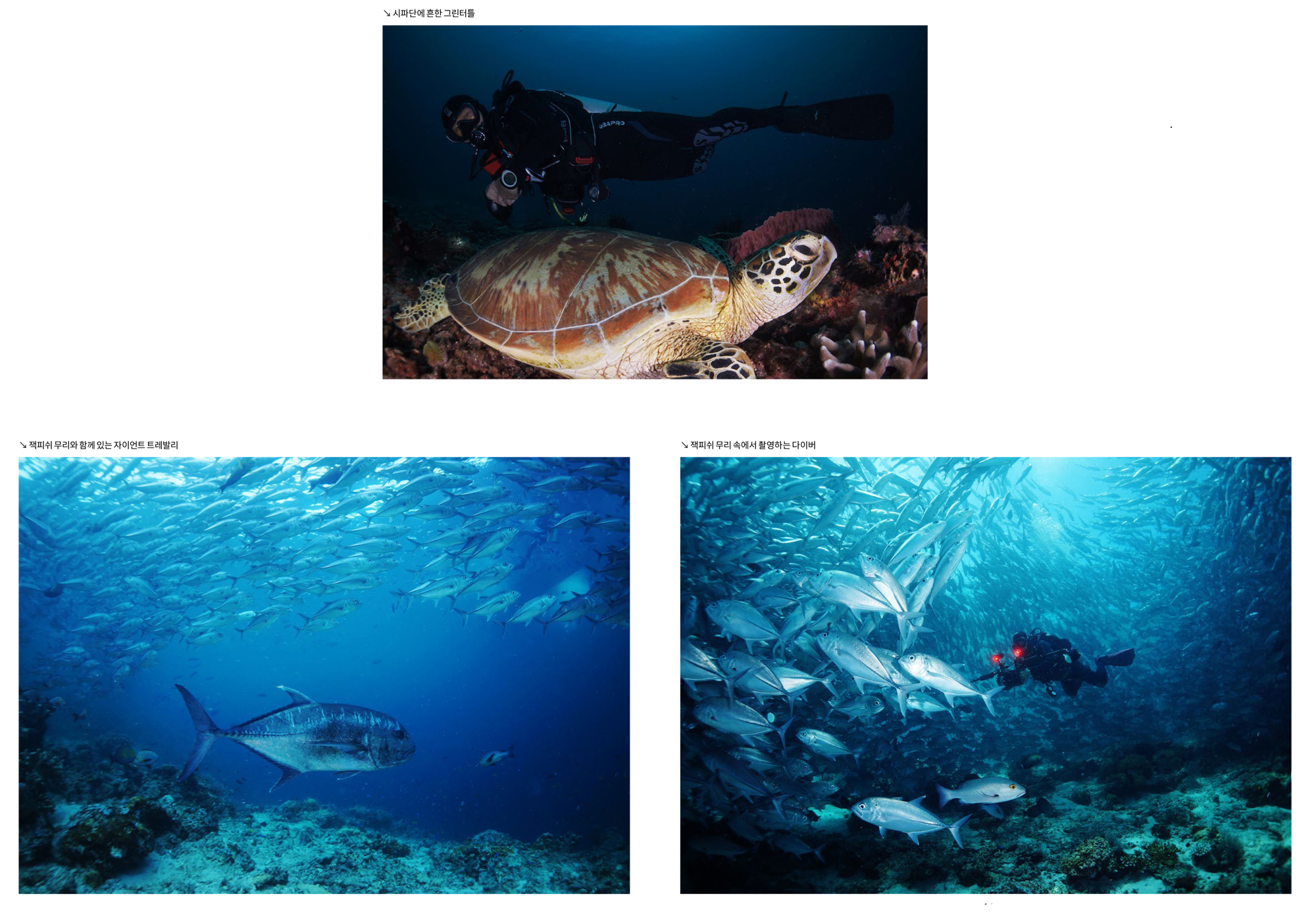 아침보다는 잦아들었으나 여전한 파도에 입수하자 마자 하강하여 물 아래에서 만나서 다이빙을 진행한다. 물 위는 파도가 치고 멀미를 일으키는 환경이었으나 물 아래는 어제보다 더 근사한 광경이 펼쳐지고 있었다.얕은 수심의 산호들은 빽빽하게 건강한 모습에 잭피쉬는 여전히 스쿨링을 하고 있고 그 옆으로 범퍼헤드 패럿피쉬들이 한창 식사에 열중하고 있는 모습이었다.