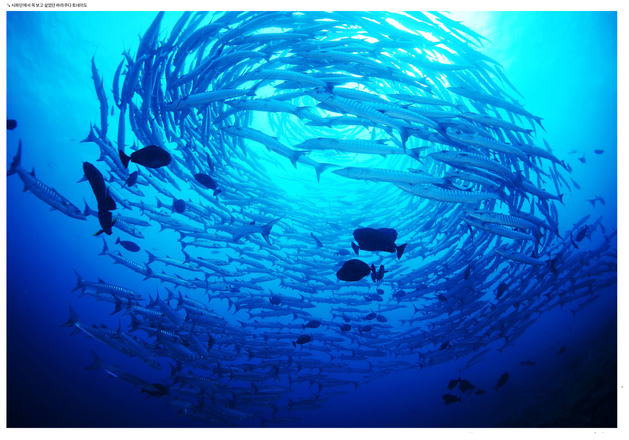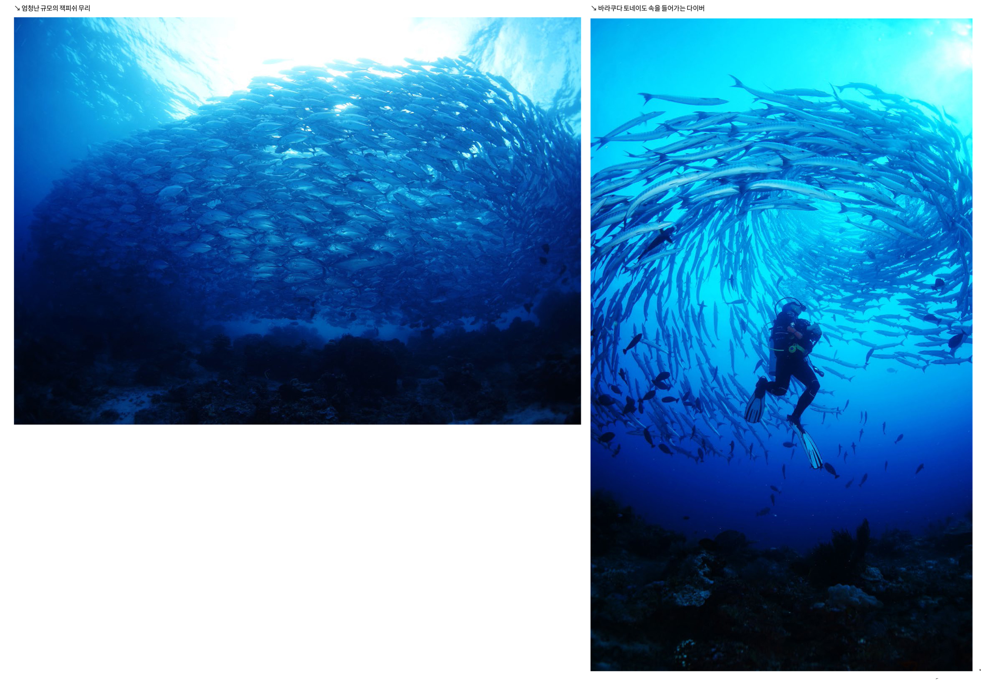 두 번째, 세 번째 다이빙에서는 어마어마한 규모의 바라쿠다 스쿨이 한바탕 바다를 휘젓고 다니는 광경을 볼 수 있었다. 한 무리가 아닌 두 무리의 바라쿠다가 스쿨링을 하는 장관을 연출하여 많은 다이버들을 황홀하게 만들어 주었다.