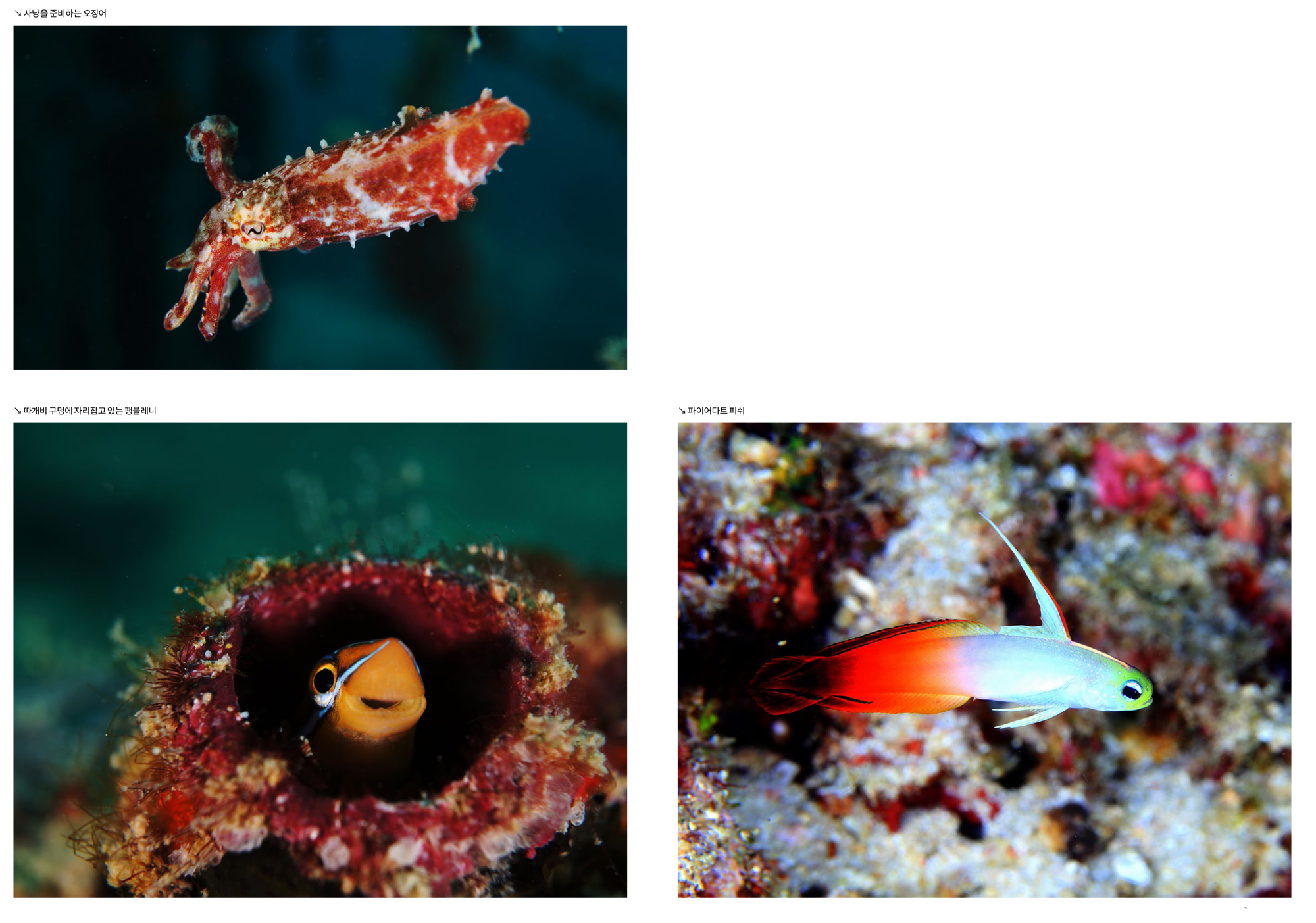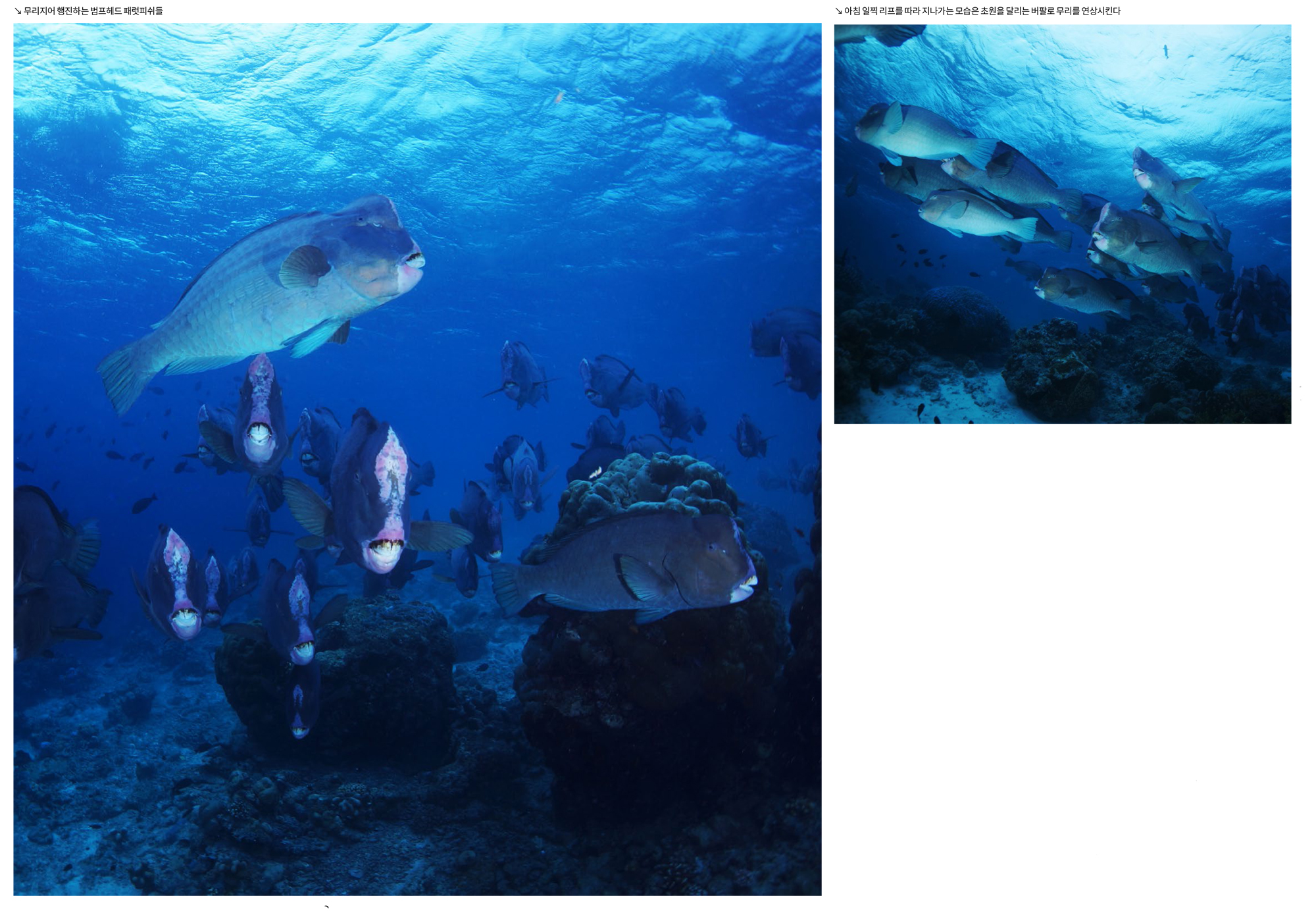서둘러 입수를 하니 가이드가 수중의 골짜기를 향해 달려간다. 골짜기에 잠을 자던 범퍼헤드 패럿피쉬들이 부스스 일어나 하나 둘 출근을 시작한다. 한 마리, 두 마리 그러다 떼를 이루어 ‘우두두두두두’소리를 내며 달려간다. 실제 소리를 내지는 않았지만 그 모습에서 ‘우두두두두두’하는 소리가 들리는 듯했다.