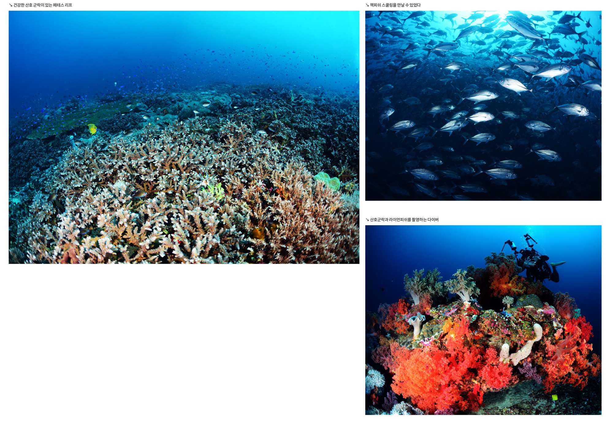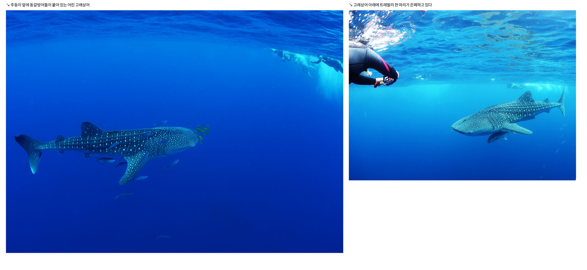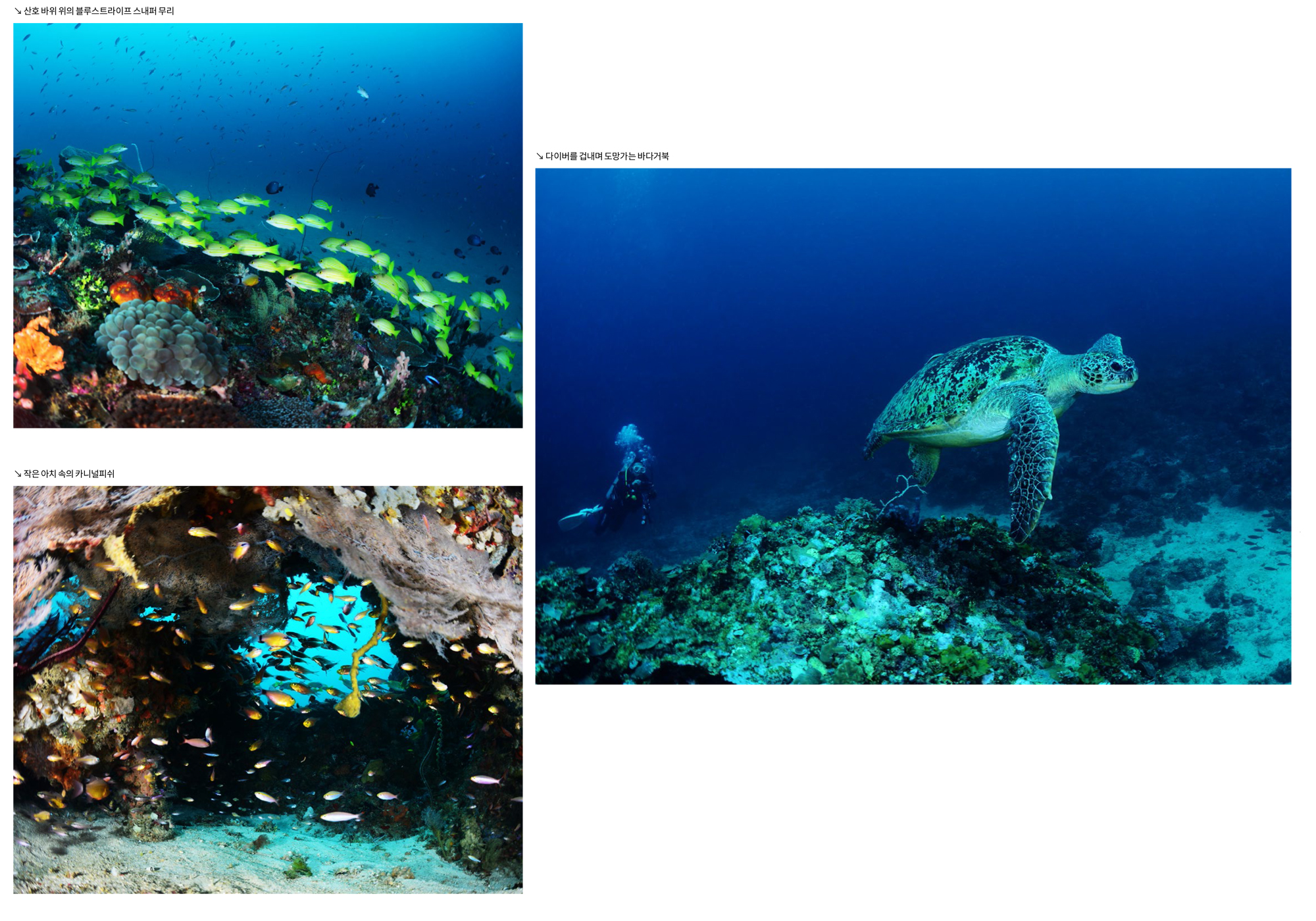마무리이번 투어는 주변의 지인들에게 기대하지 말고 한번 가 보자며 진행하였다. 맑은 하늘과 잔잔한 수면 등 육상의 아름다운 경치와는 전혀 어울리지 않는 흐린 시야에 당혹스러웠지만 몇몇 포인트에서 만났던 건강한 산호와 아치, 잭피쉬와 물고기 무리, 바다거북 등은 그 와중에도 다이빙을 즐겁게 해주었다. 또한 고래상어와 함께 한 스노클링도 신이 날 정도였다.