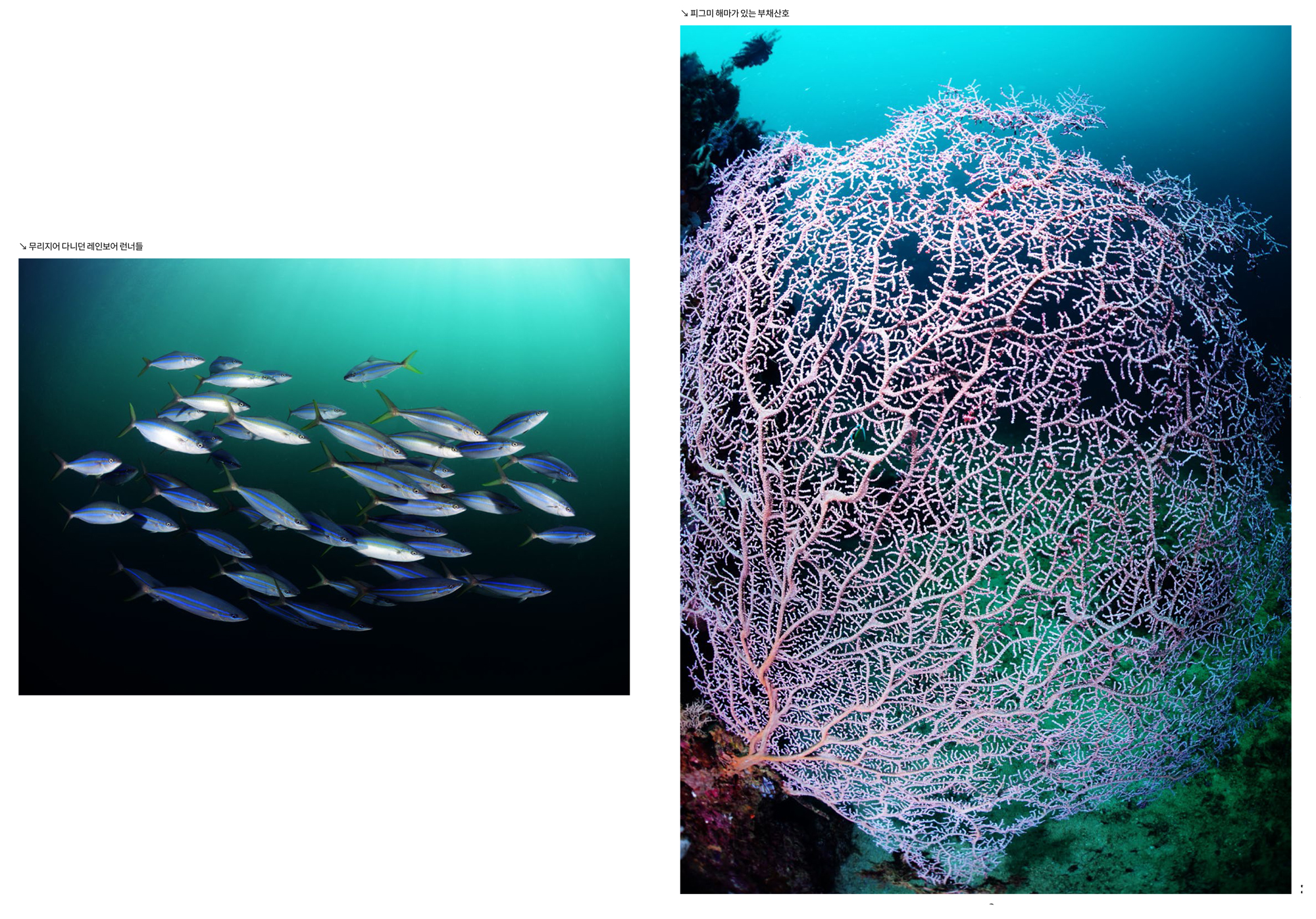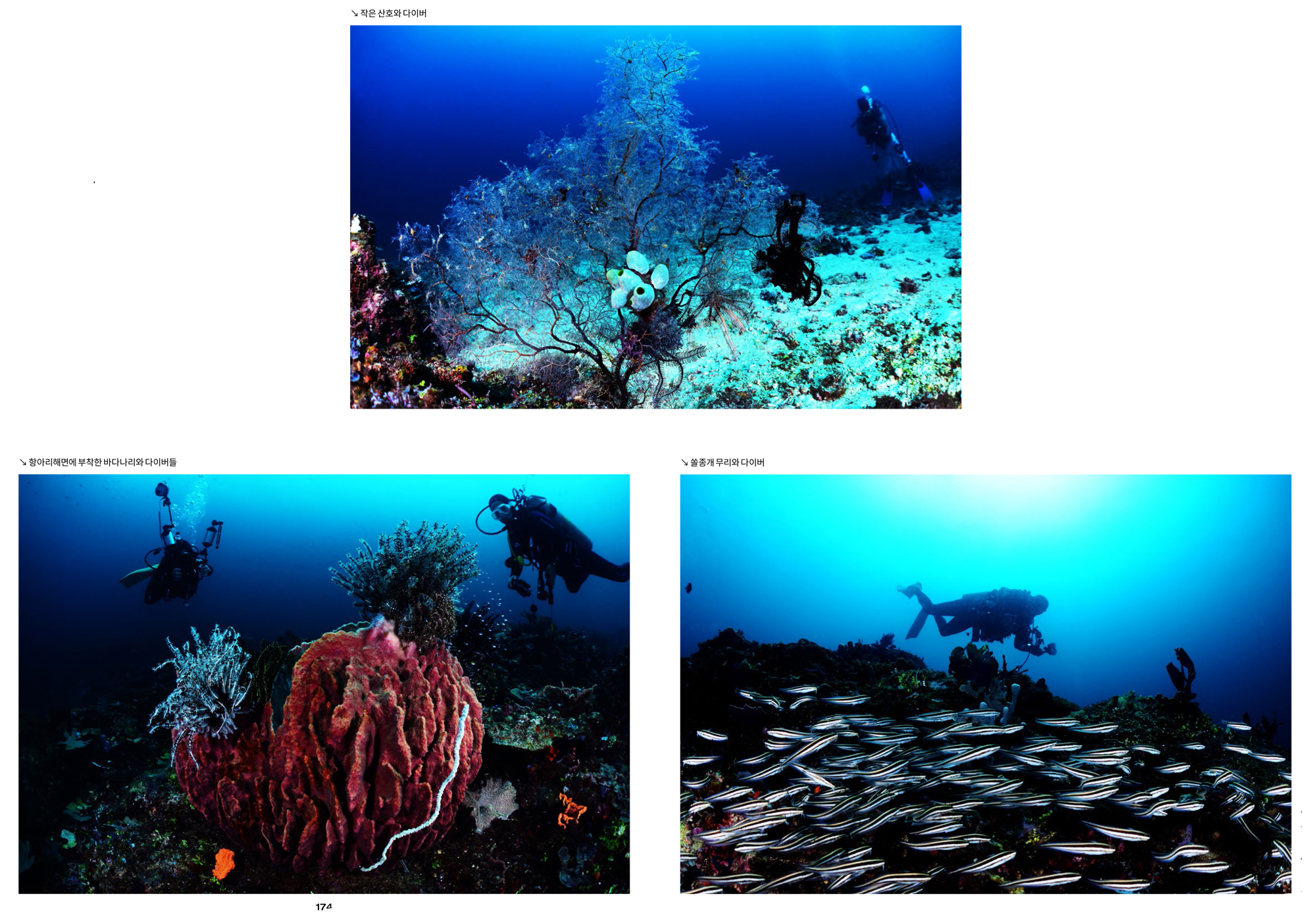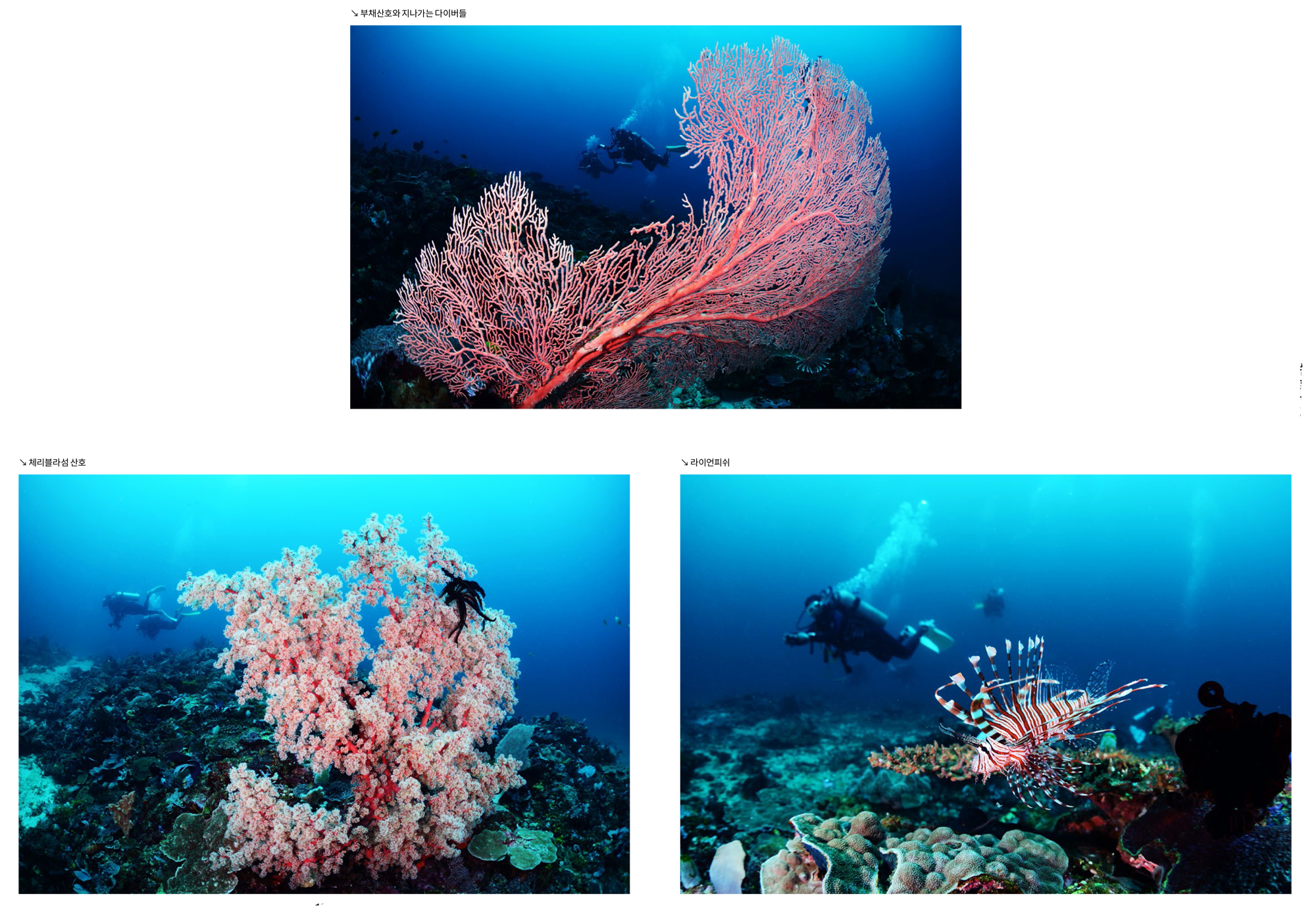 마무리이번 투어는 주변의 지인들에게 기대하지 말고 한번 가 보자며 진행하였다. 맑은 하늘과 잔잔한 수면 등 육상의 아름다운 경치와는 전혀 어울리지 않는 흐린 시야에 당혹스러웠지만 몇몇 포인트에서 만났던 건강한 산호와 아치, 잭피쉬와 물고기 무리, 바다거북 등은 그 와중에도 다이빙을 즐겁게 해주었다. 또한 고래상어와 함께 한 스노클링도 신이 날 정도였다.