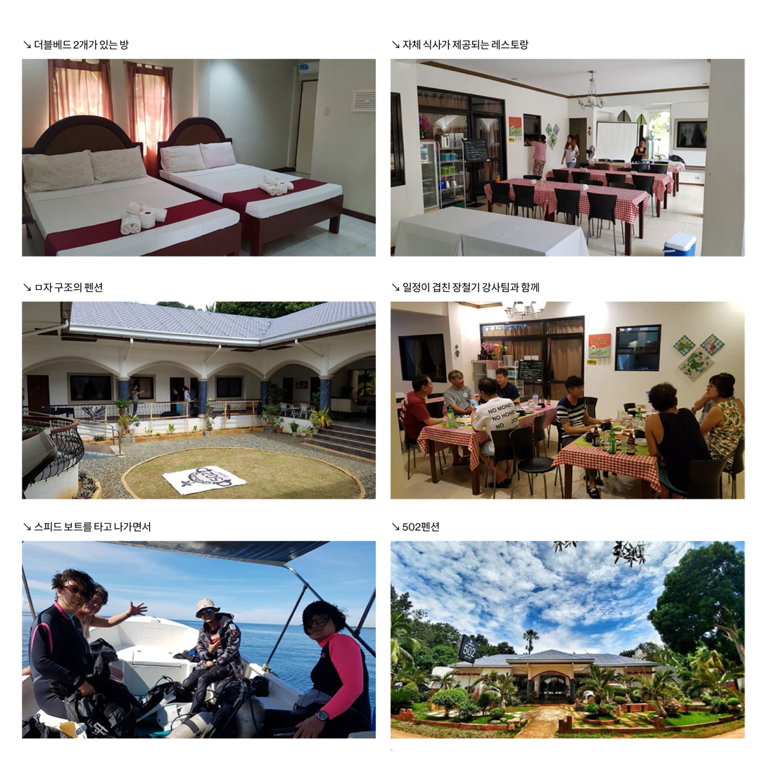 팔라완 502 펜션의 경우 그간 자유여행객들을 위한 숙소와 육상 관광 프로그램 위주로 서비스해왔고, 전문적인 다이버들의 방문은 그렇게 많지 않았다. 이번 직항편 취항을 계기로 강사들이 인솔하는 그룹 다이버들 위주로 받고는 있지만 전체적인 운영 시스템이 아직은 다이버들의 입맛에 맞게 잘 짜여 있지 않다. 다만 오동원 대표가 적극적으로 인솔 강사들의 조언을 구하면서 시스템을 갖추려고 노력하고 있기 때문에 시간이 지나면서 점차 정비가 될 것으로 보인다. 초기에 방문하는 다이버들은 이런 점을 감안하여야 할 것이다.