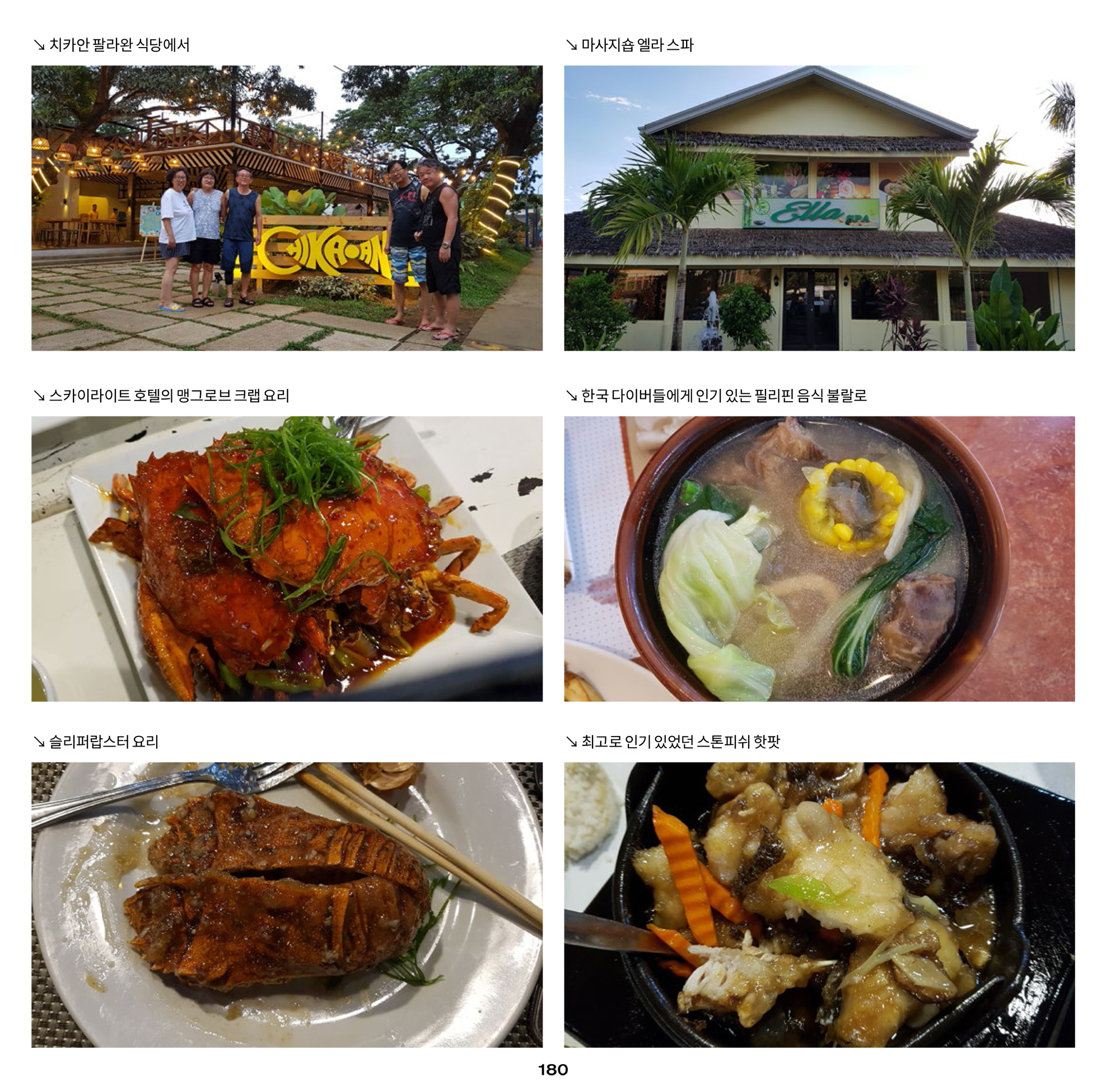 마사지 숍과 로컬 레스토랑다이빙이 늦어도 오후 4시 이전에 모두 끝나기 때문에 자유시간에 펜션 인근의 마사지 숍을 찾아 휴식을 취하거나 SM 몰 등을 찾아 쇼핑을 할 수 있다. 펜션에서 제공하는 저녁식사 대신 외부에서 식사를 할 경우에 한국인들이 좋아할 만한 식당들을 소개해주는데 씨푸드 레스토랑은 다이버들에게도 좀 알려져 있는 바자오 Bajao 보다는 스카이라이트 호텔 레스토랑을 추천한다. 분위기는 좀 떨어지지만 가성비는 훨씬 뛰어나다. 필리핀 로컬 레스토랑은 최근에 오픈한 프렌차이즈 레스토랑 치카안 팔라완 Chikaan sa Palawan을 소개해주었다. 역시 가성비가 좋은 곳이다.