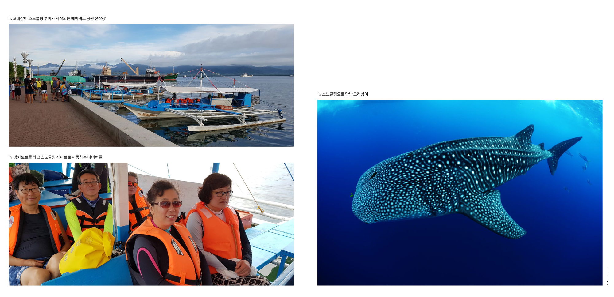 고래상어 스노클링 투어필리핀에서 고래상어 스노클링 프로그램을 운영하는 곳이 오슬롭과 푸에르토 프린세사의 혼다베이가 있다. 하지만 혼다베이에서는 피딩을 하지 않기 때문에 고래상어를 자연상태에서 볼 수 있다는 것을 강조하고 있다. 팔라완 502 펜션에서 고래상어 스노클링을 패키지에 포함시킨 것은 탁월한 선택이라고 생각한다. 처음 푸에르토 프린세사 다이빙에 크게 실망했지만 일정이 지나면서 점점 다이빙이 괜찮아 진다고 느꼈고, 마지막에 고래상어 스노클링을 하면서 매우 즐거웠기 때문이다. 스쿠버 다이빙으로 보면 좋겠지만 스노클링으로 만나도 다이버라면 누구나 좋아할 수밖에 없는 것이 고래상어 아닌가?