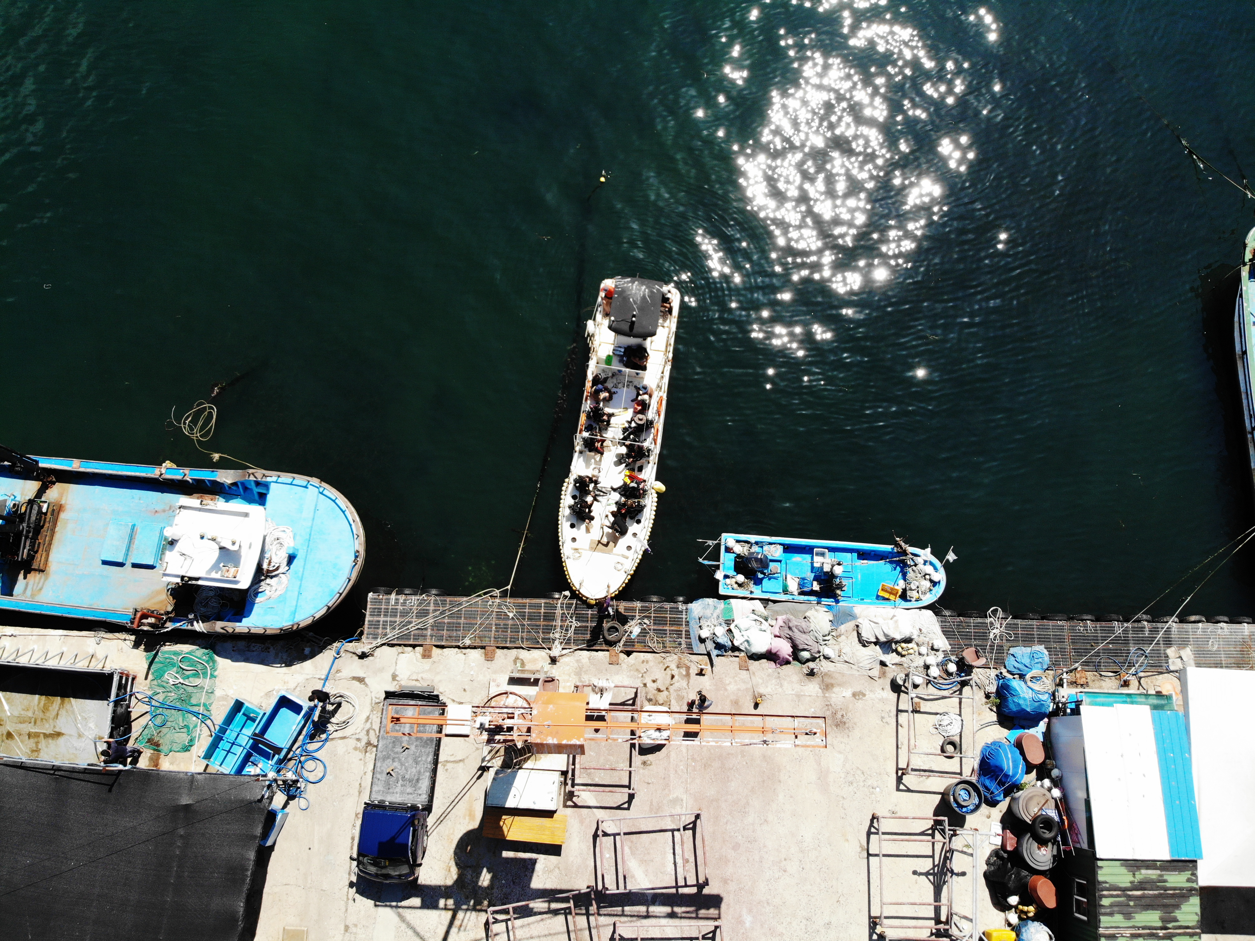 드론으로 촬영한 사천항과 다이빙을 나가는 해원리조트 전용선