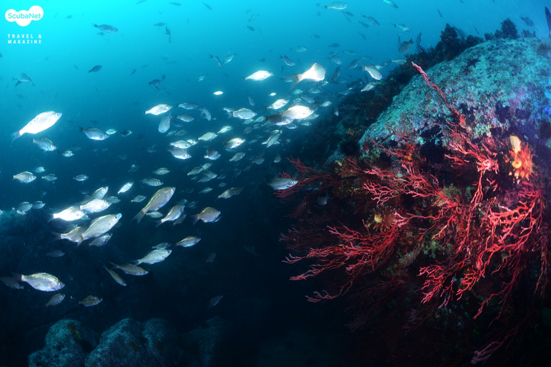 민둥산 포인트의 부채뿔산호 군락과 인상어 무리